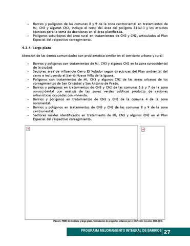 Barrios y polígonos con tratamientos de MI, CN3 y algunos CN2 en la zona suroccidental de la ciudad Sectores área de influencia Cerro El Volador según directrices del Plan ambiental del cerro e incluyendo el barrio Nueva Villa de la Iguaná. Polígonos con tratamientos de MI, CN3 y algunos CN2 de las áreas urbanas de los corregimientos de San Cristóbal y San Antonio de Prado. Barrios y polígonos en tratamientos de CN3 y CN2 de las comunas 5,6 y 7 de la zona noroccidental con análisis de las zonas verdes públicas producto de cesiones urbanísticas ocupadas con vivienda. Barrios y polígonos en tratamientos de CN3 y CN2 de la comuna 4 de la zona nororiental. Barrios y polígonos en tratamientos de CN3 y CN2 de las comunas 8 y 9 de la zona centroriental. Sectores rurales identificados en tratamiento de MI, CN3 y algunos CN2 en el Plan Especial del respectivo corregimiento.