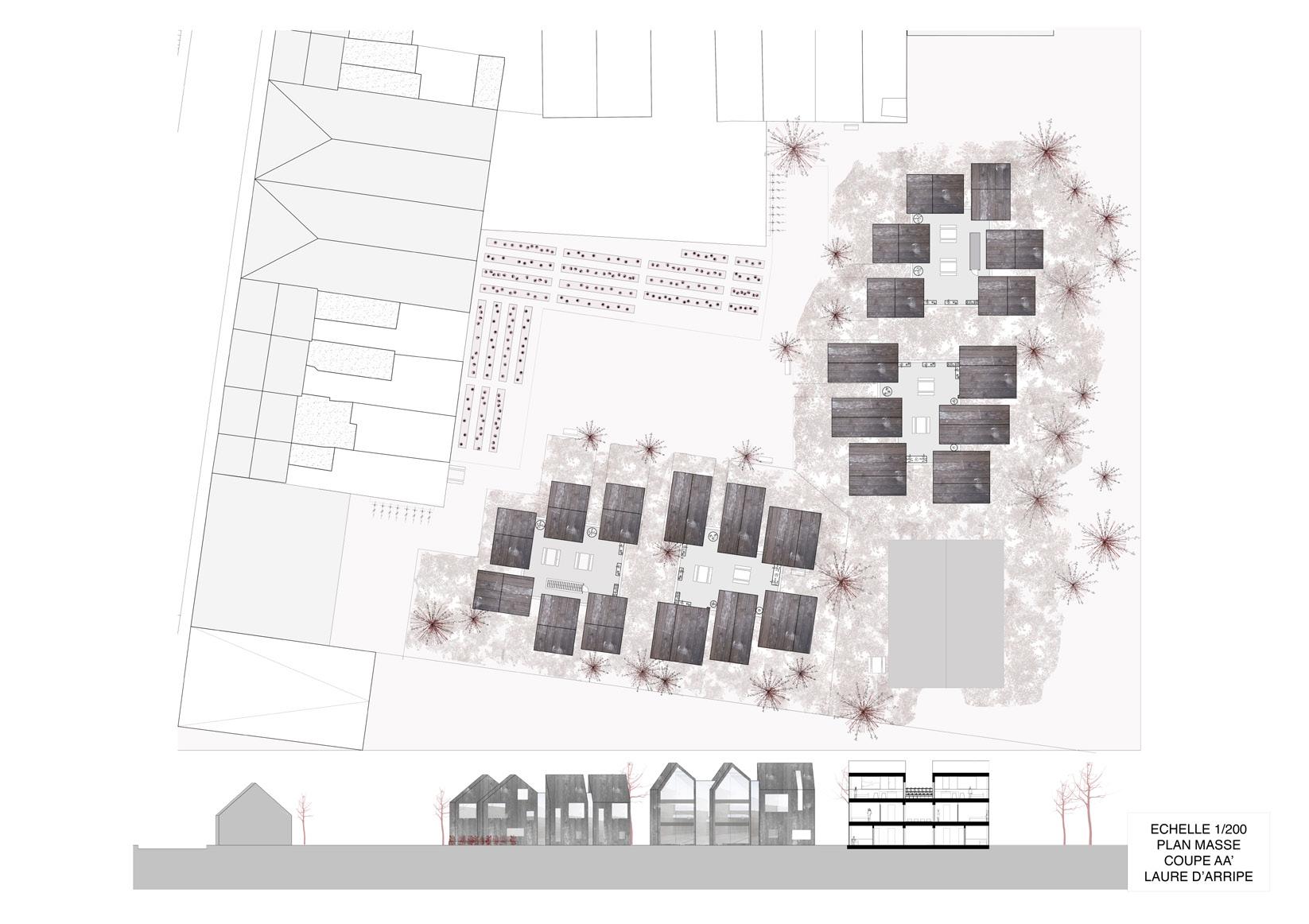 Complexe d’habitation de 36 logements destinés à des familles nucléaires, personnes célibataires, personnes âgées avec un revenu modeste. Une ceinture végétale se place tout autour des logements afin de les intimiser. Le projet part de quatre larges blocs communs dans les quels viennent s’emboîter des blocs de logements privés. Ceux-ci sont réduits au maximum afin de privilégier une vie communautaire et limiter l’emprise au sol.