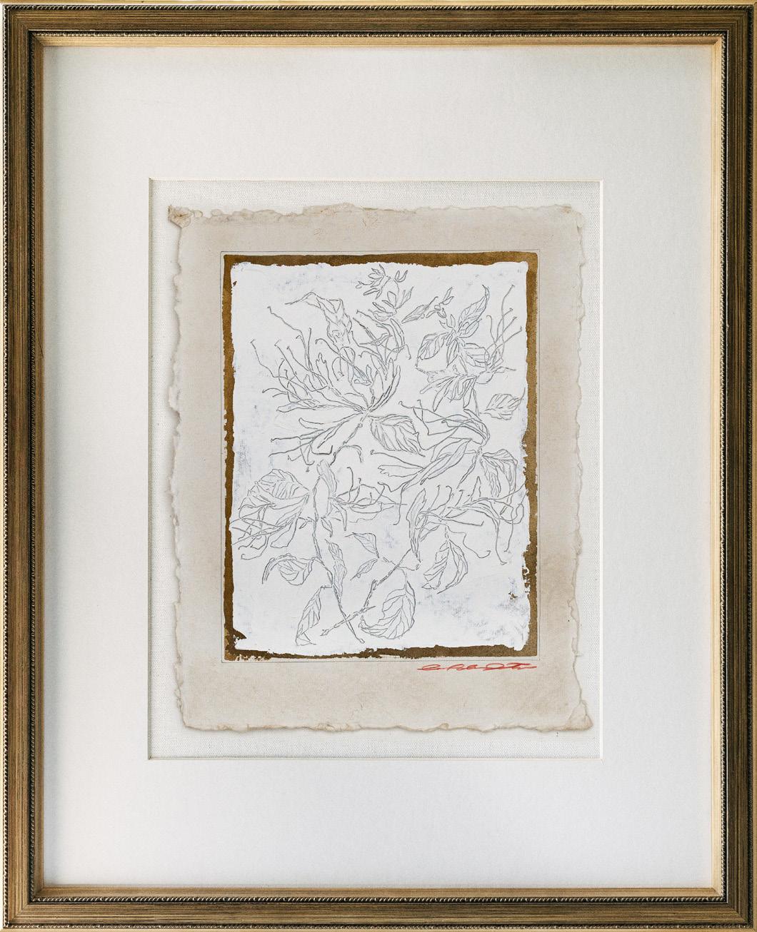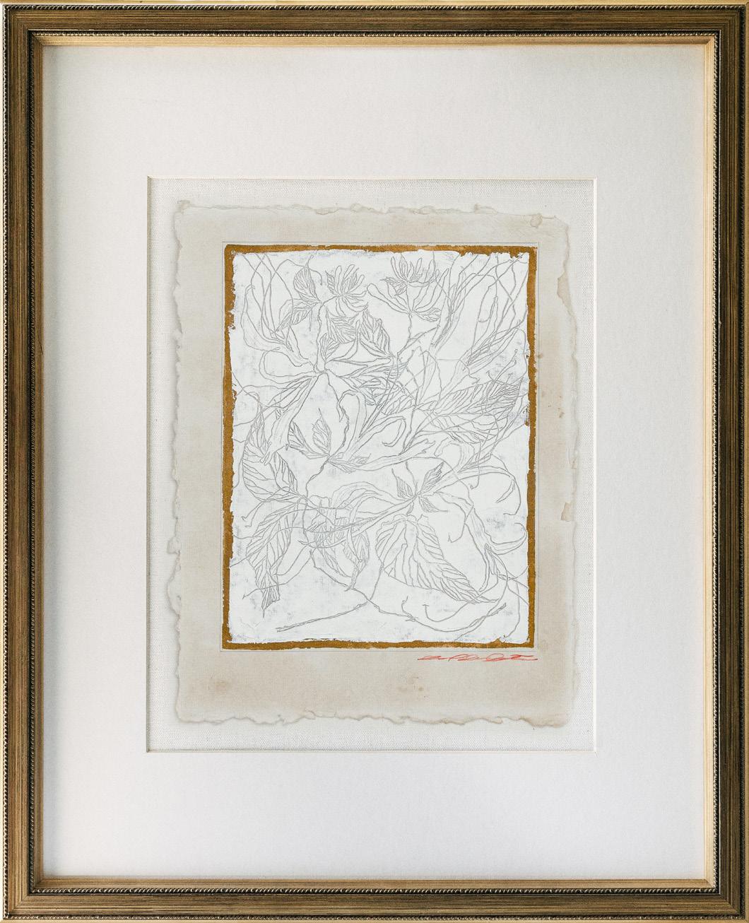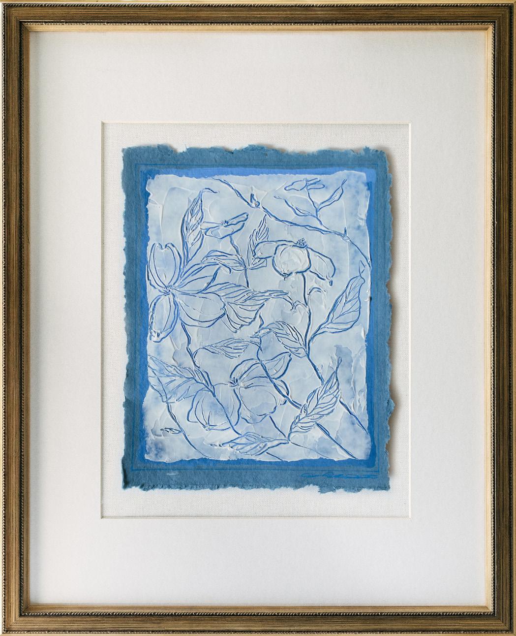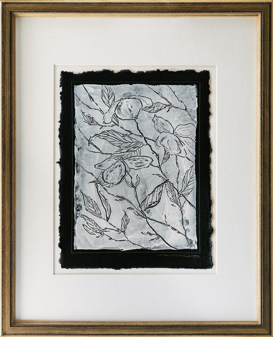 These mixed media original works are created by layering pencil, acrylic, gouache, heavy modeling paste and oil to set the stage for delicately carved botanicals. Each piece is painted on handmade, hand dyed, 100% cotton paper with a natural deckled edge.