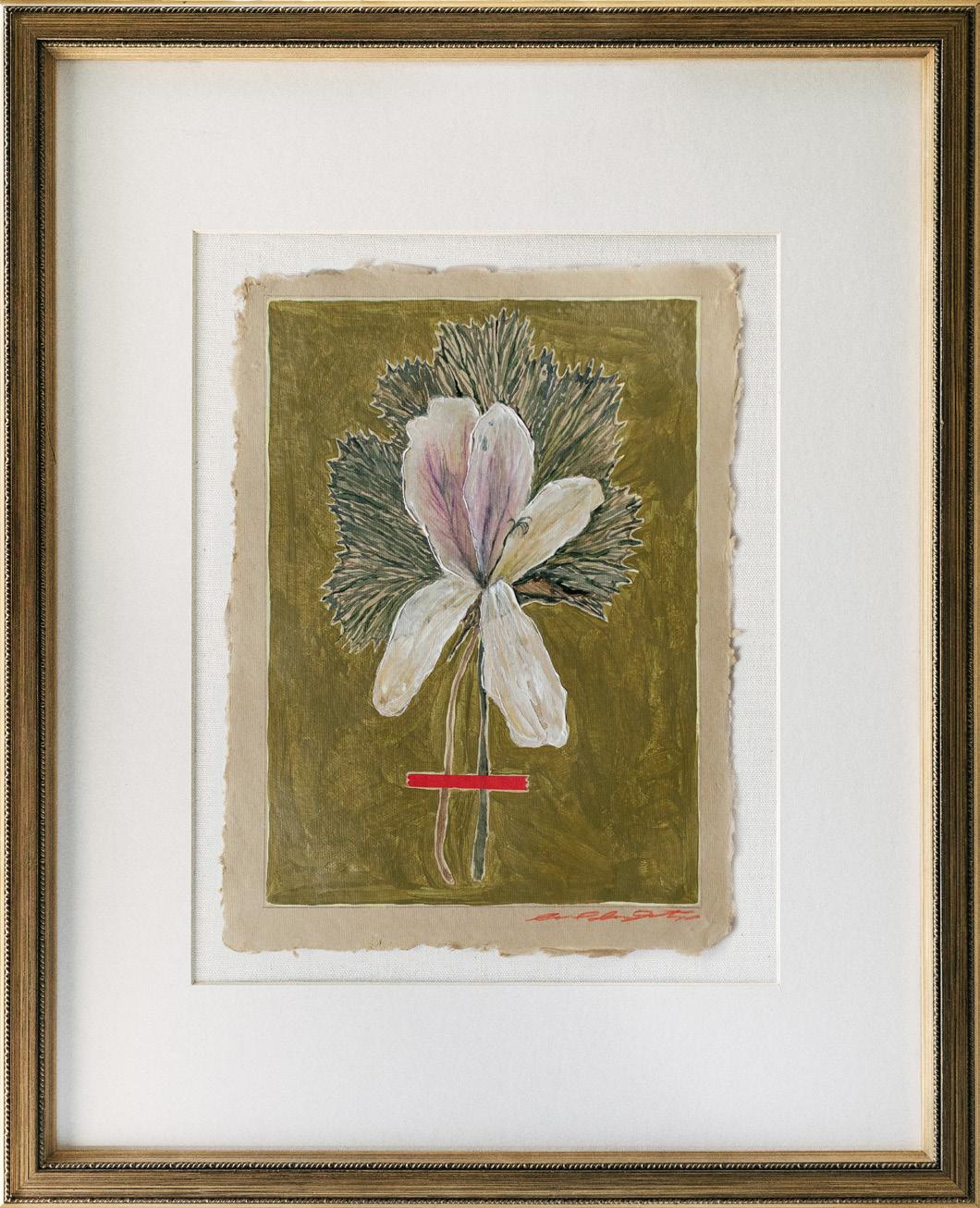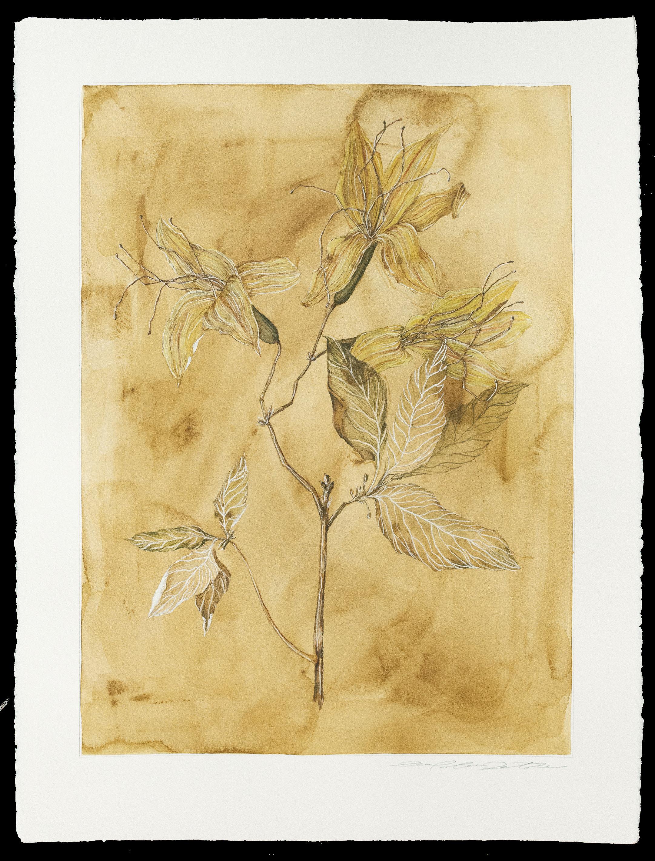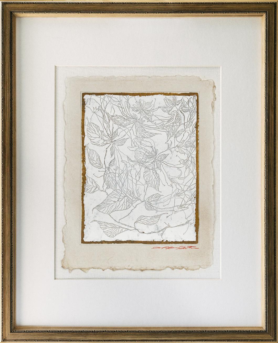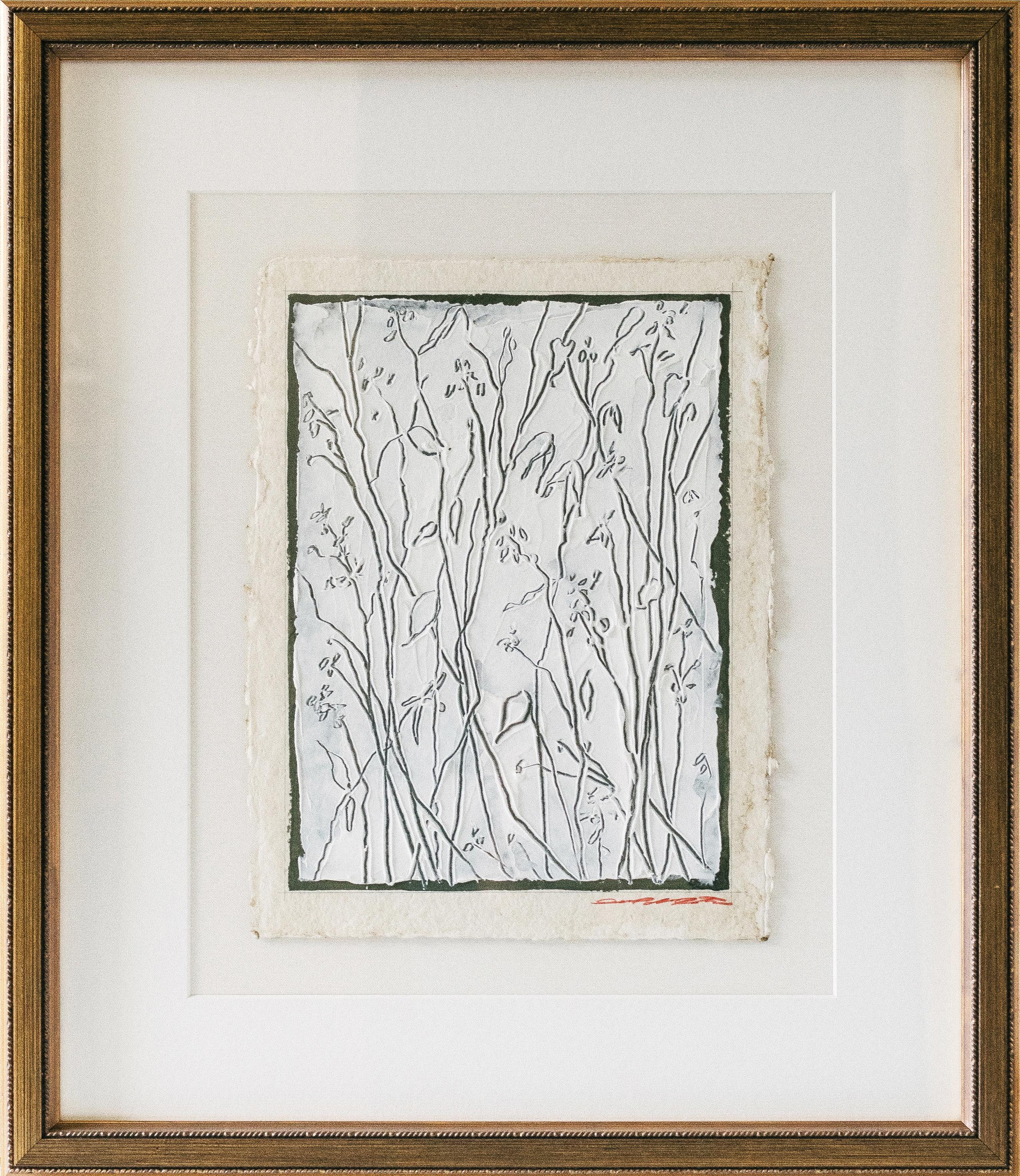 These mixed media original works are created by layering pencil, acrylic, gouache, heavy modeling paste and oil to set the stage for delicately carved botanicals. Each piece is painted on handmade, hand dyed, 100% cotton paper with a natural deckled edge.
