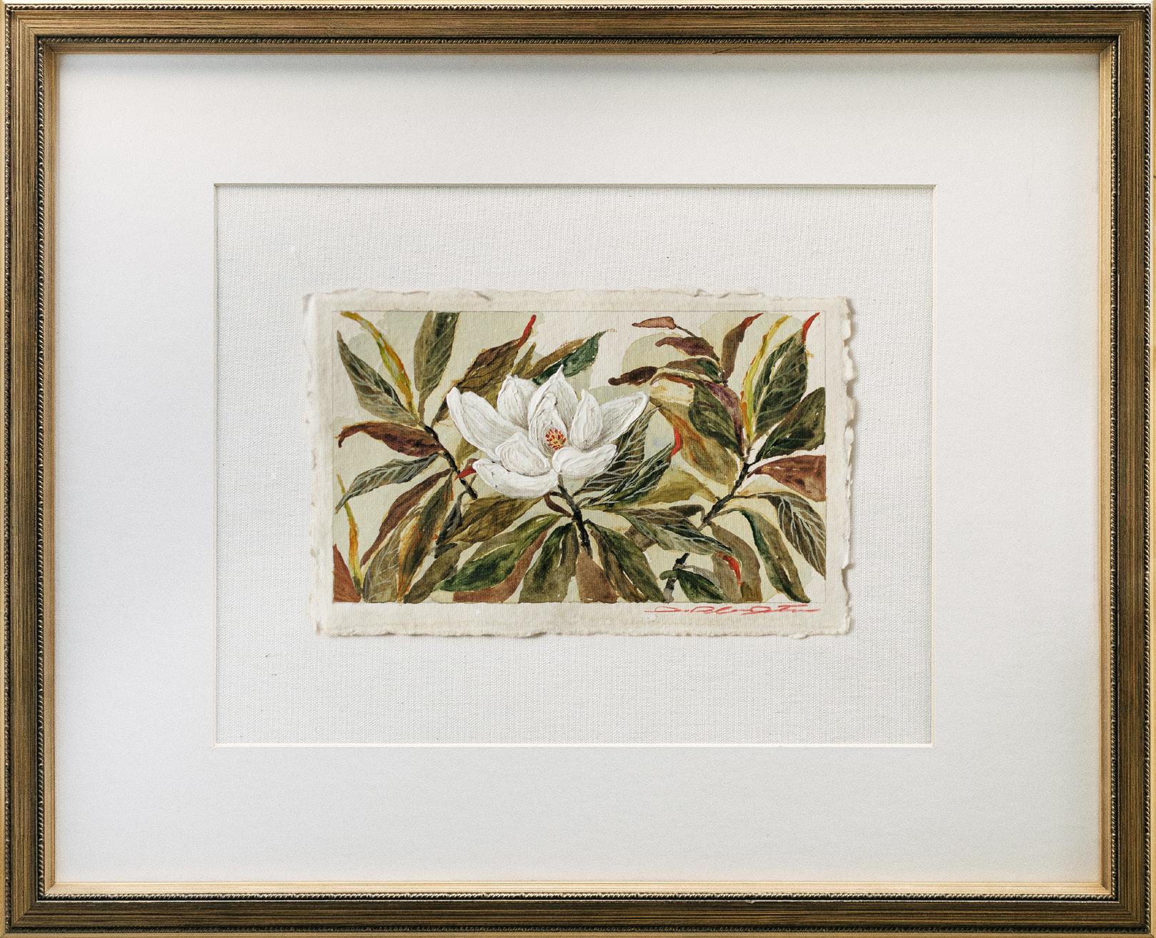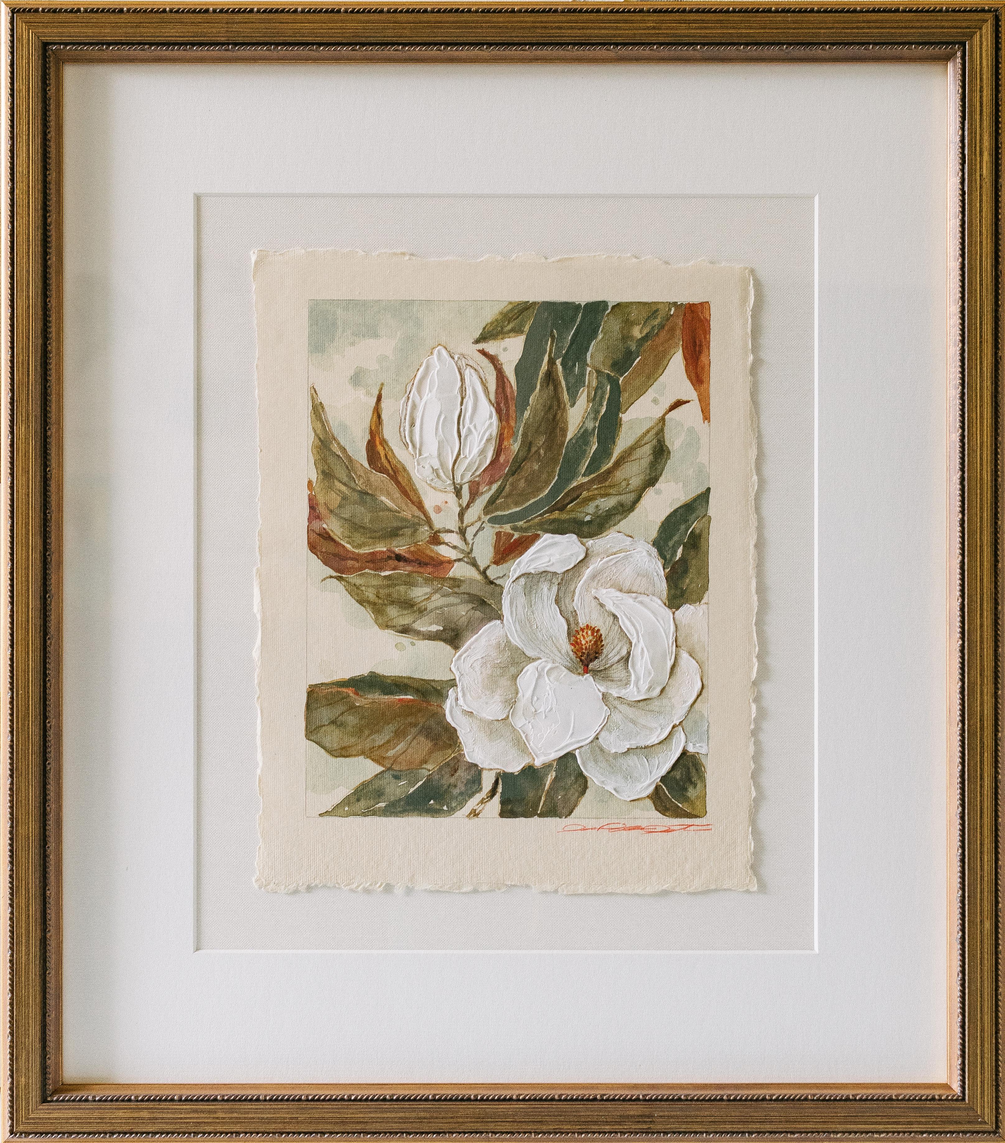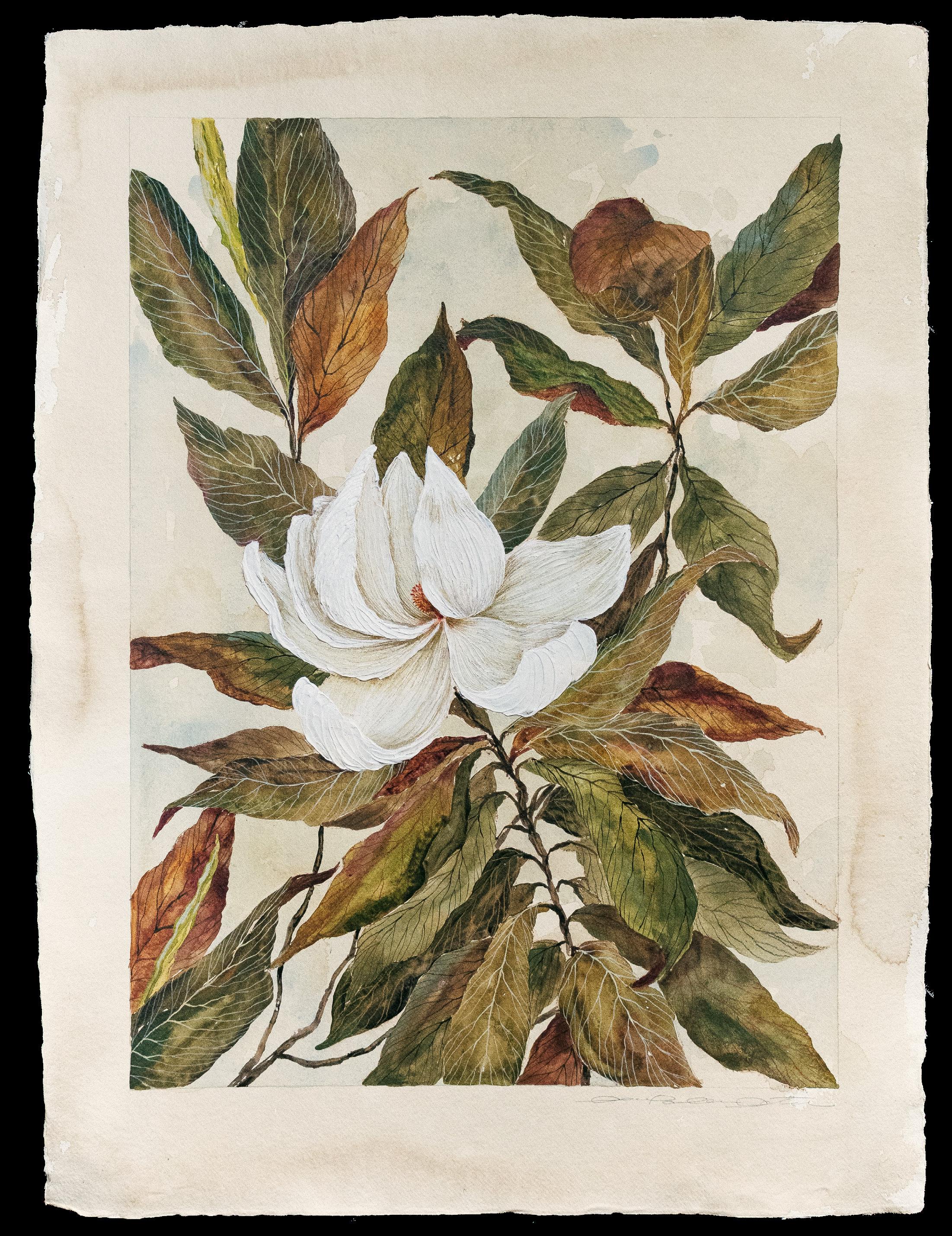These mixed media, original works are painted on handmade, hand dyed paper with a dekled edge. Each piece studies the sweet, familiar southern bloom with green and amber leaves, vibrant and dramatic in shape and texture. magnolia