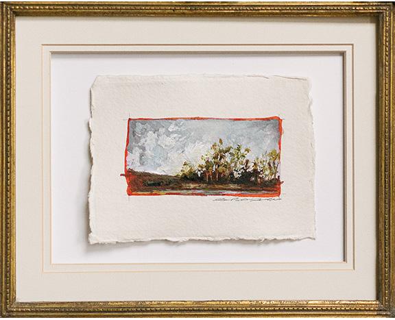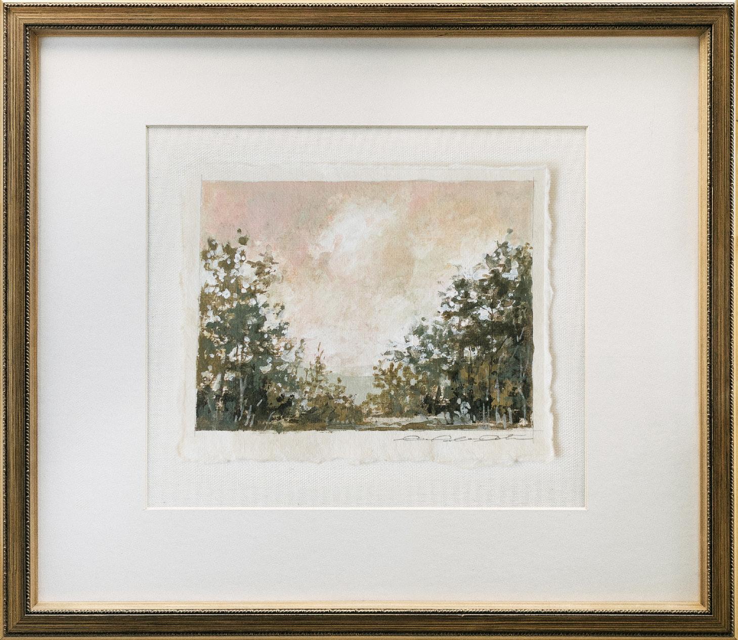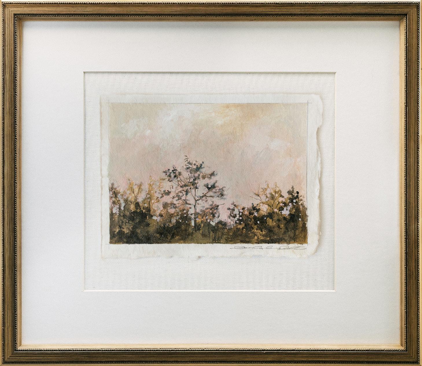 This collection uses a limited color palette and focuses on dreamy landscapes and treetops that are full of light and billowing clouds. The works themselves are petite and cause the viewer to lean in to take in the details.