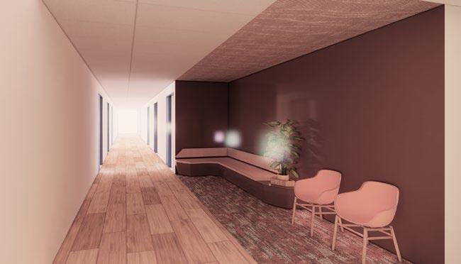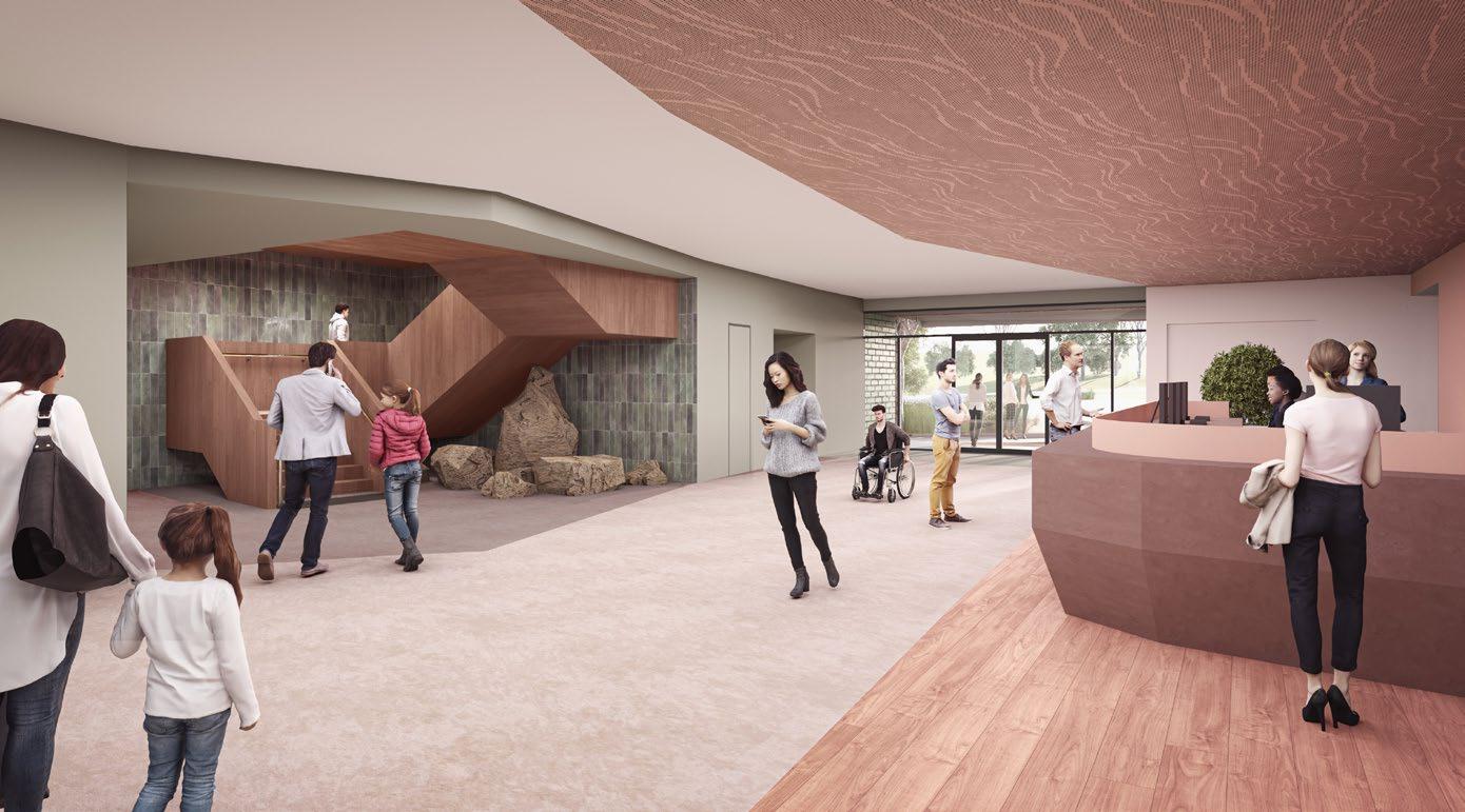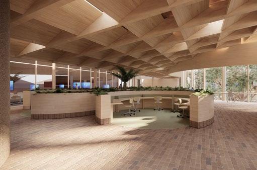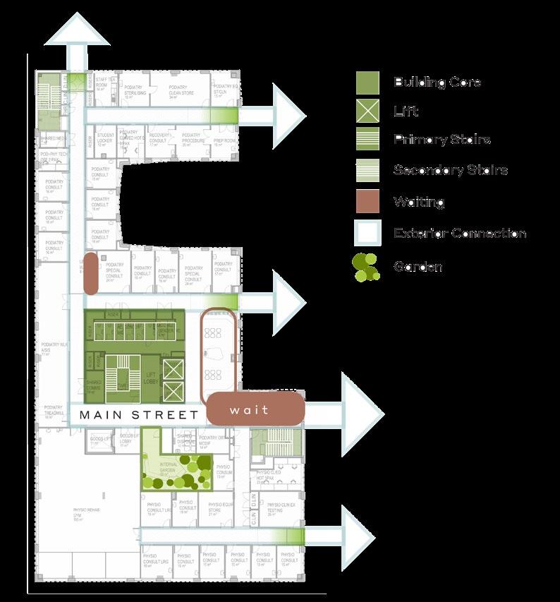 Key design principles for this new dual function building are focused on patient experience, accessibility to external vistas, biophilia, separating clinial and teaching spaces, and design for wellbeing.
