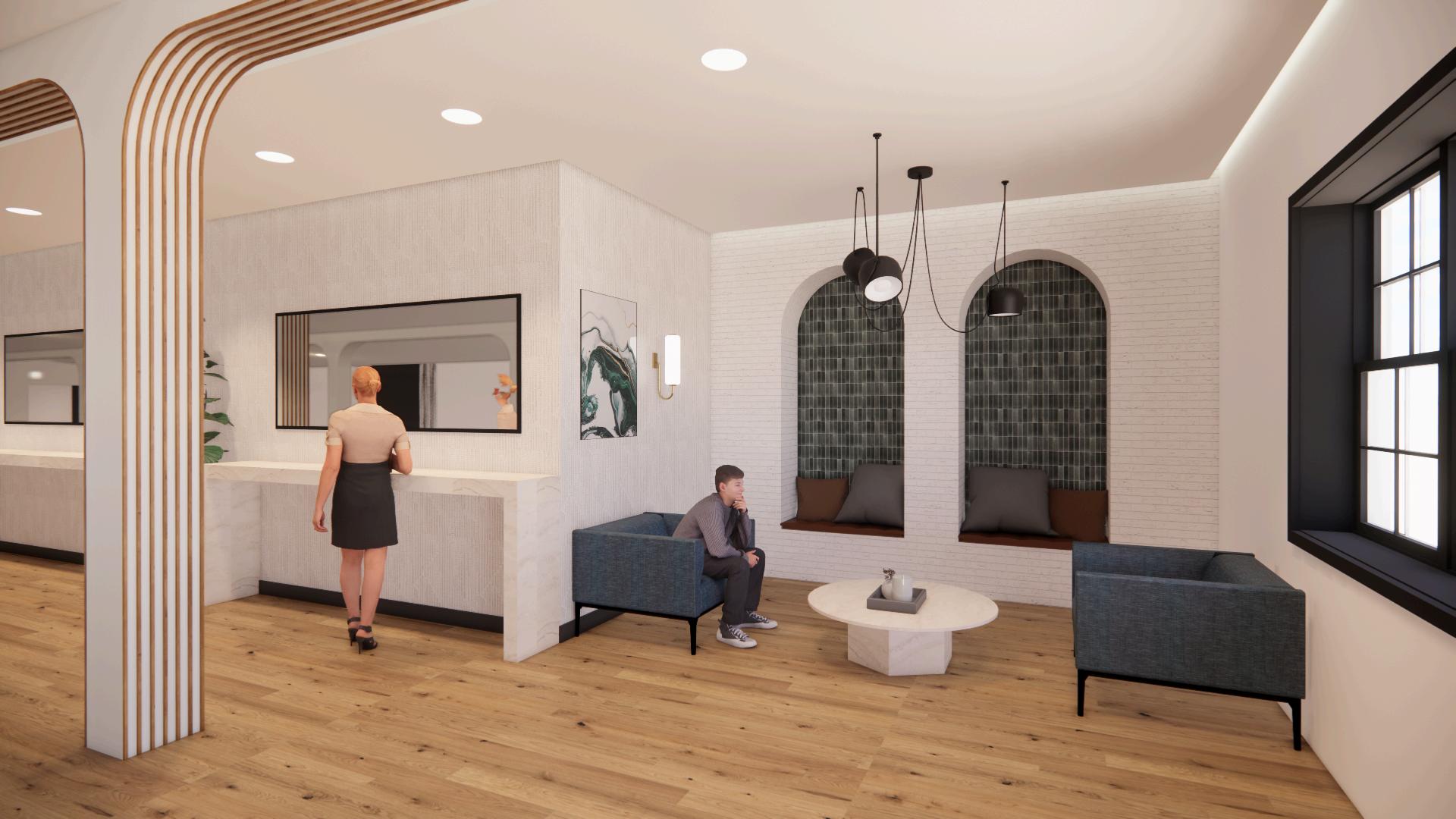 This restroom design continues the Weaving of Time concept with soft arches, clean lines, and natural finishes. Arched doorways and mirrors establish rhythm and continuity, while the contrast between dark flooring and light walls adds depth. Soft lighting and simple materials keep the space feeling calm, modern, and cohesive with the rest of the center.