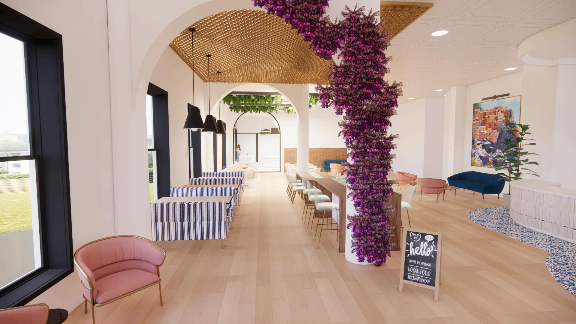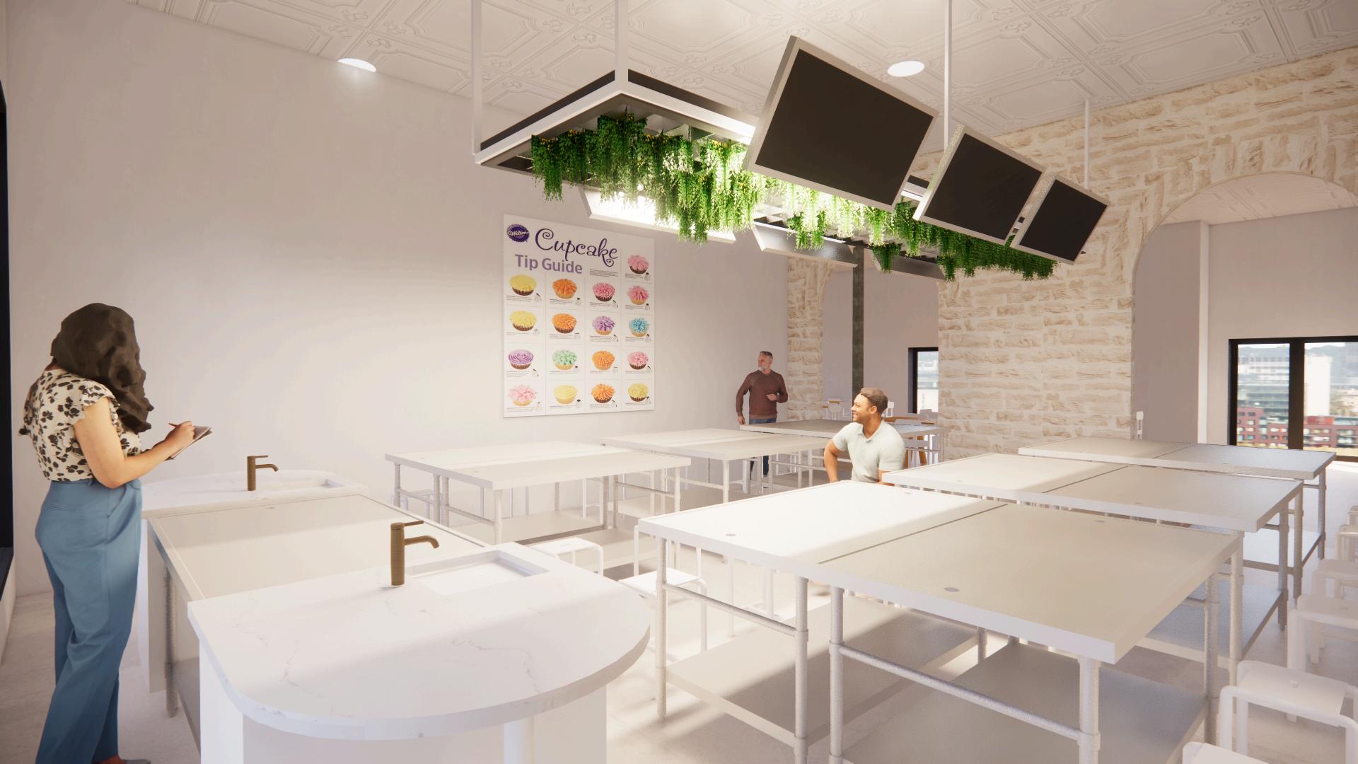 For the design of this experiential kitchen, I aimed to make it as engaging as possible. It is laid out for flexibility, allowing tables and chairs to be moved around as needed. A teaching station at the front of the room allows for live cupcake decorating demonstrations. Above the decorating stations, there is a hanging open storage space for items like bowls and utensils, discreetly framed by hanging greenery. Another great feature of this space is the TV mounted from the hanging storage unit, ensuring everyone can see what the teacher is demonstrating.