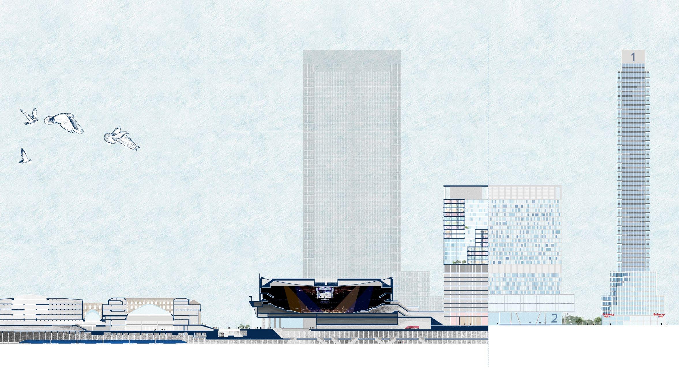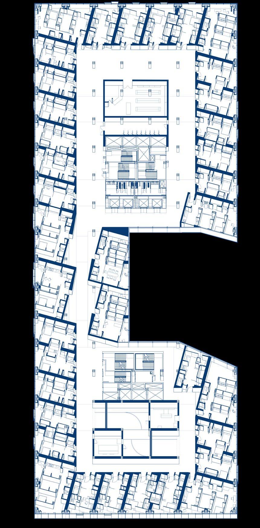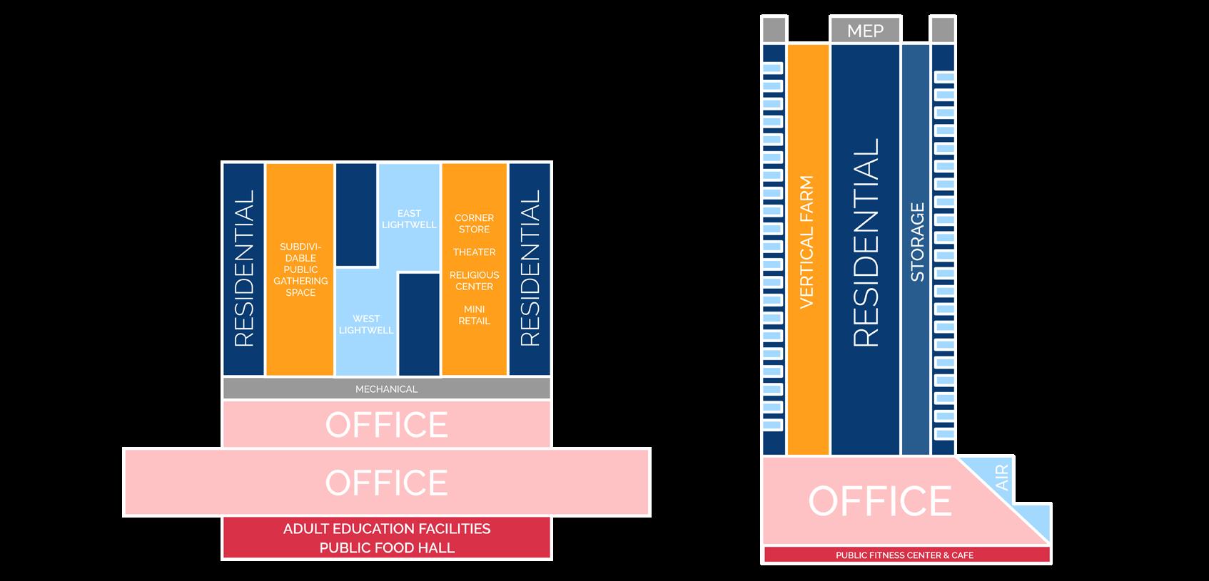 Each site building is designed as a small city, and to make them livable, universal access to light, outdoor space, and basic needs were prioritized. Office and retail floors were kept to offset housing costs.