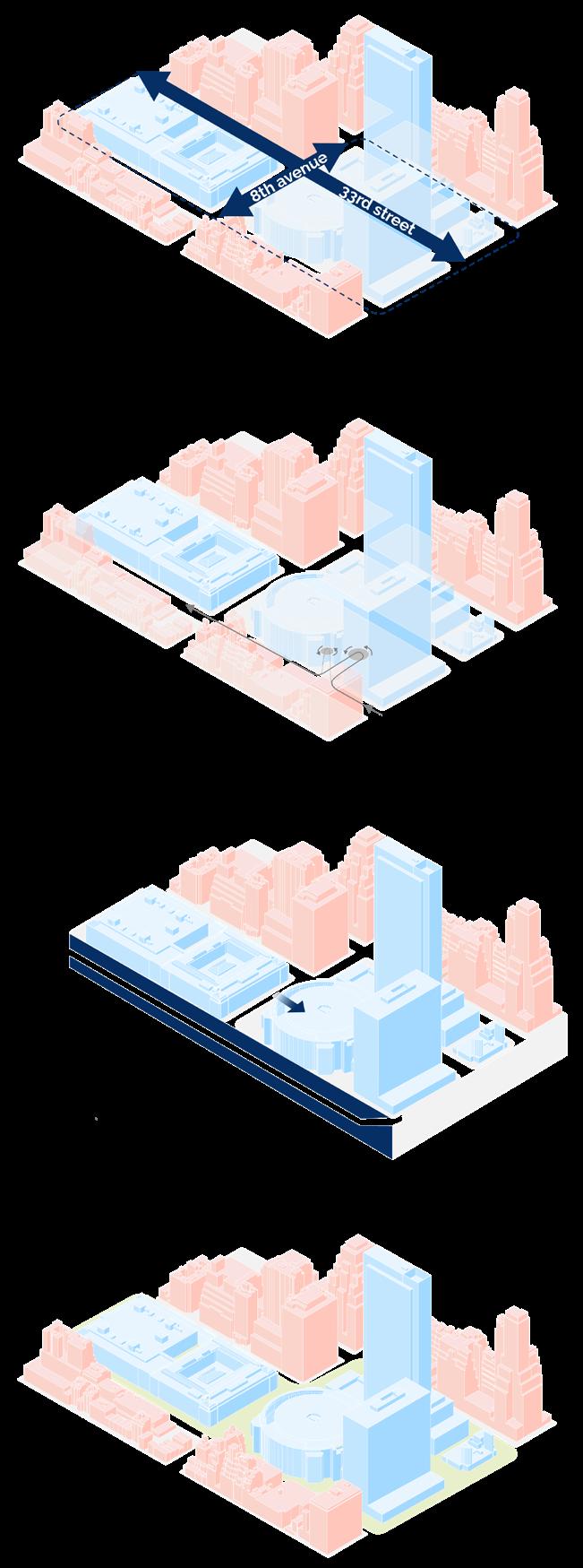 The project occupies the entire urban block. Beginning underground, it alters the transit network from Moynihan Train Hall to Penn Station by consolidating Penn station’s access points for improved way-finding and circulation.