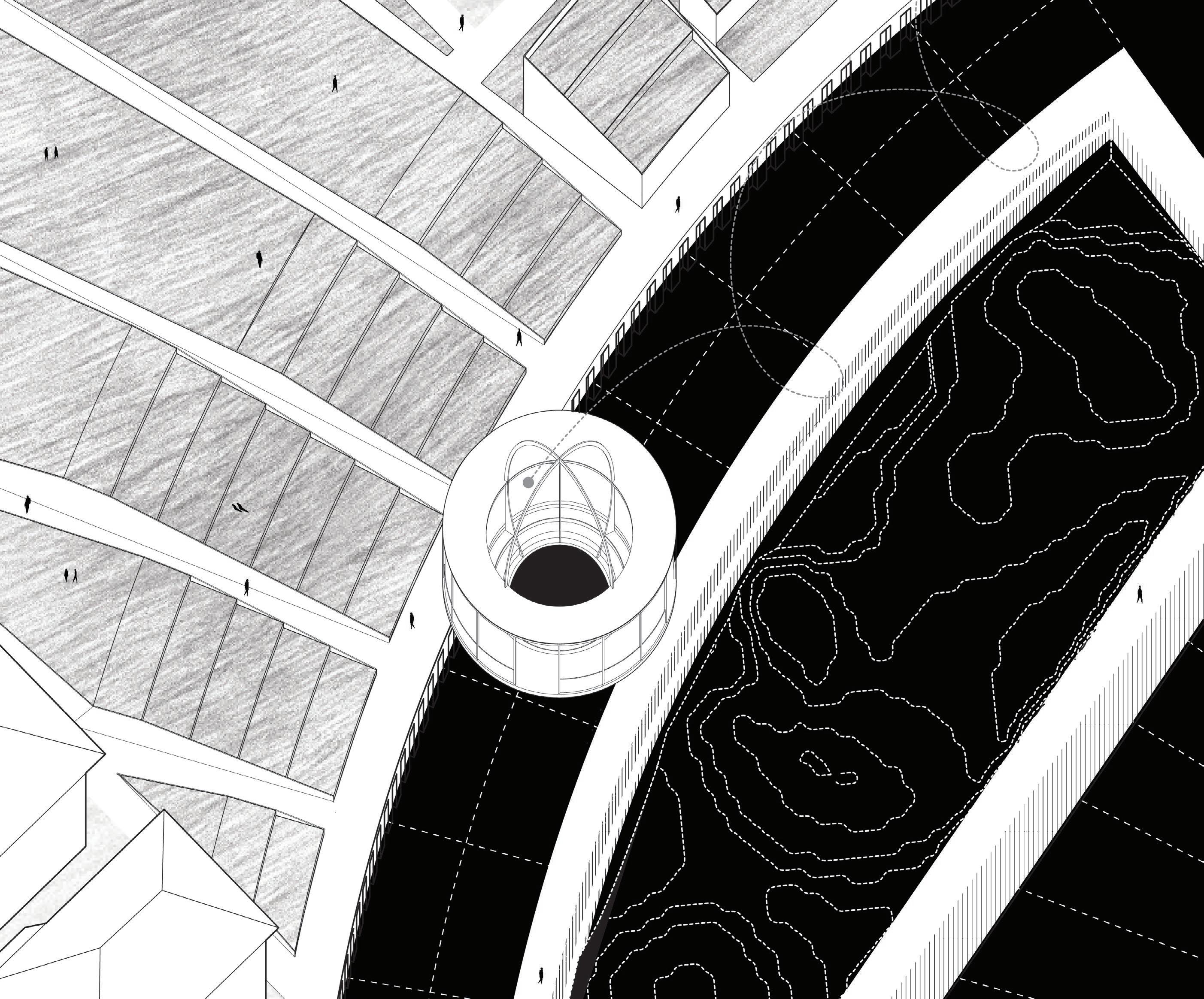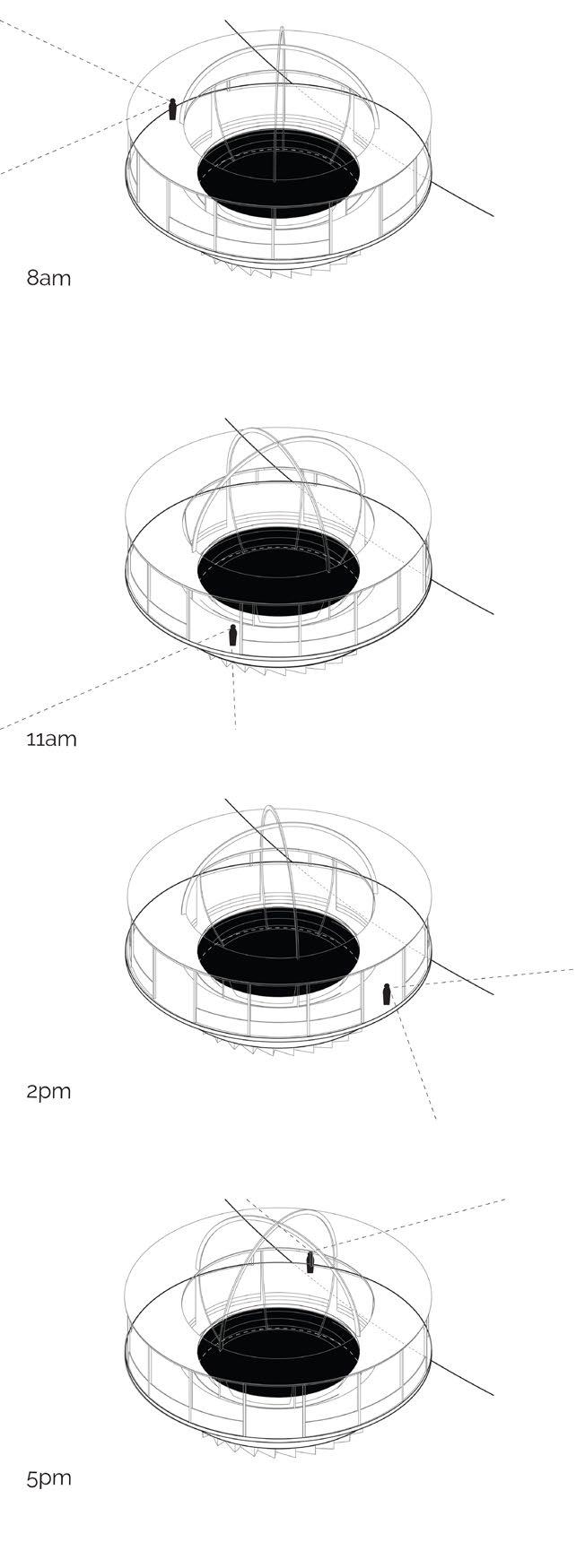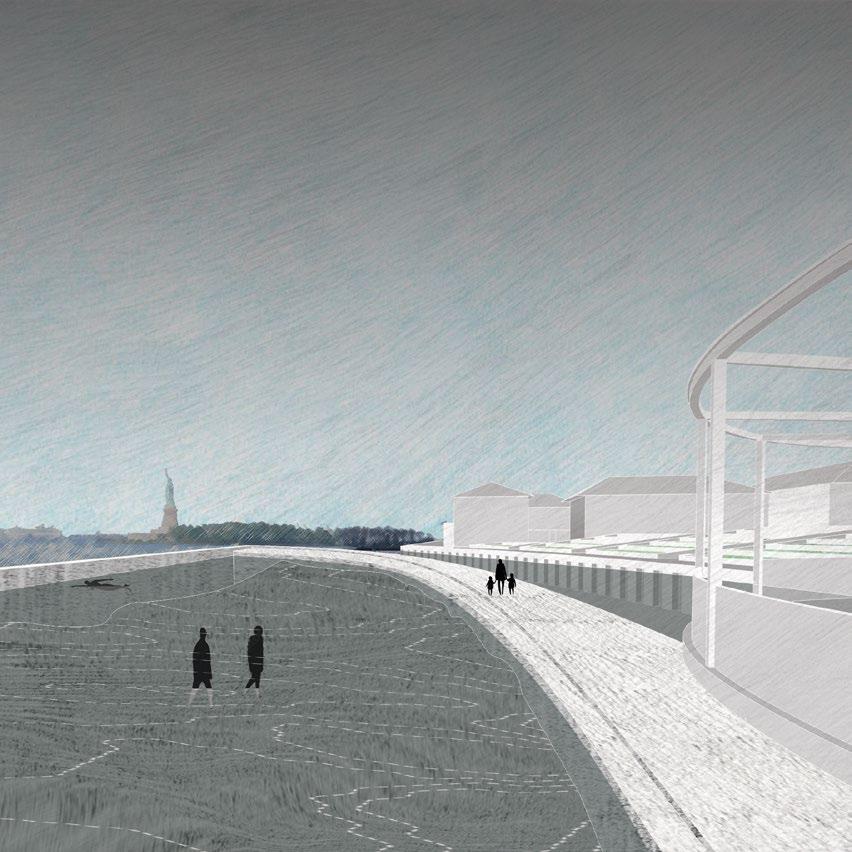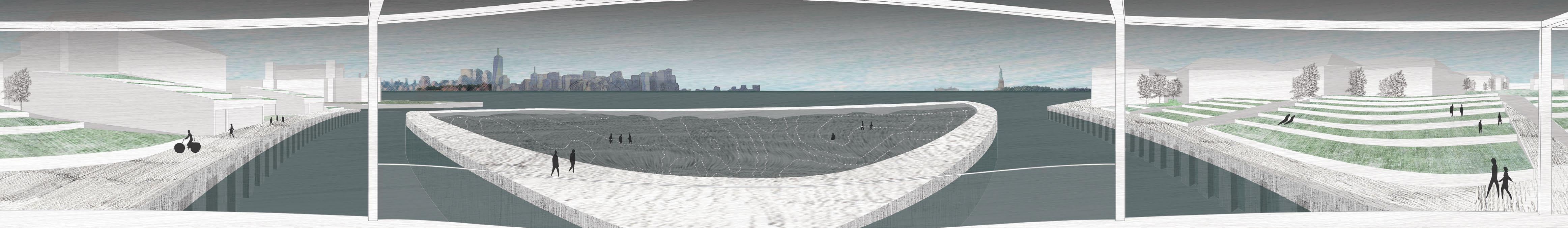 One side of the island uses terraced landscaping to represent the concrete and recorded number of immigrants that used it as a boundary through decades of time, while the other is a wade pool with a landscape hidden under the water surface to represent the stories of “hidden” immigrants and migrants coming into America whose stories may only be known through oral histories. The vessel that connects these two sides of the island is a moving pool that slowly rolls along the edge of one side such that pedestrians can get on and off of it without the pool having to stop.