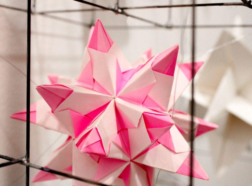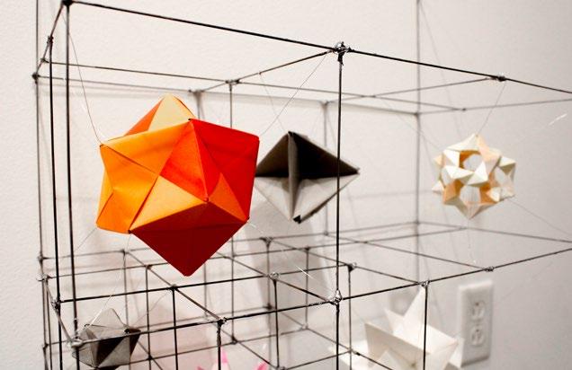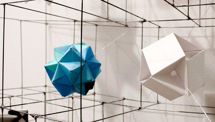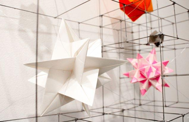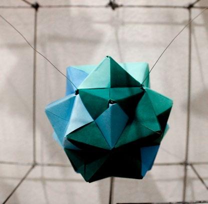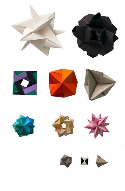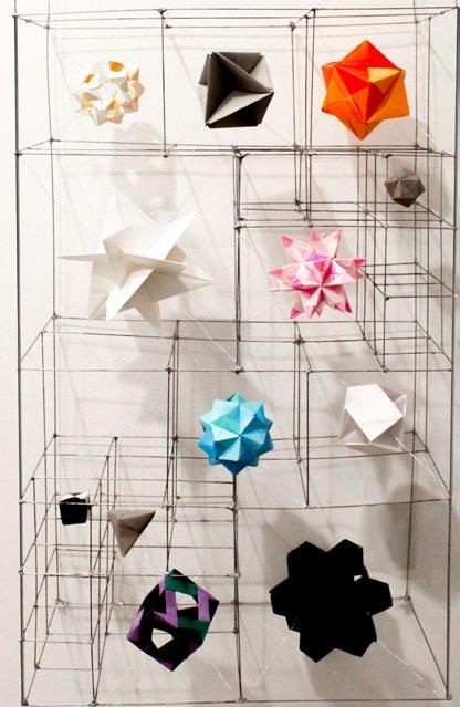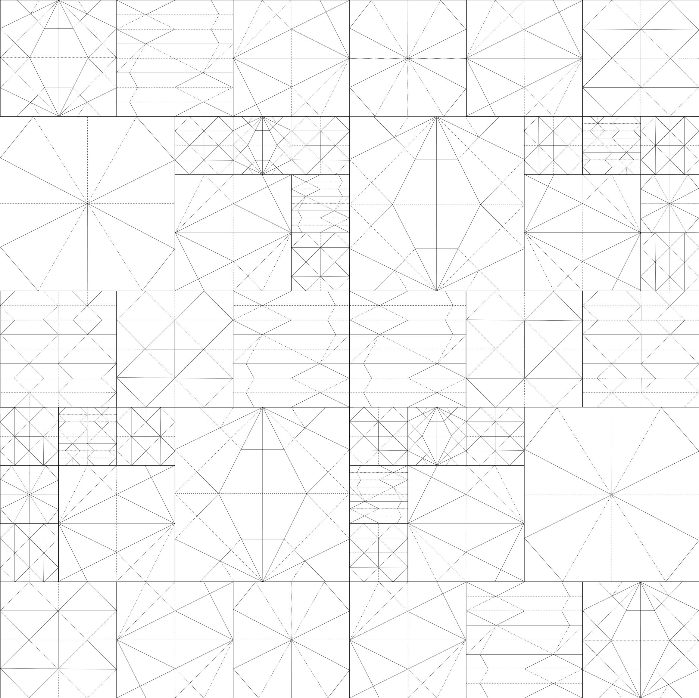 This project is a metal container for my collection of modular origami pieces, each of which is made from several folded pieces of paper. The map on the left is each of these papers unfolded, leaving behind the creases that become a how-to guide for building the units again.