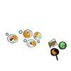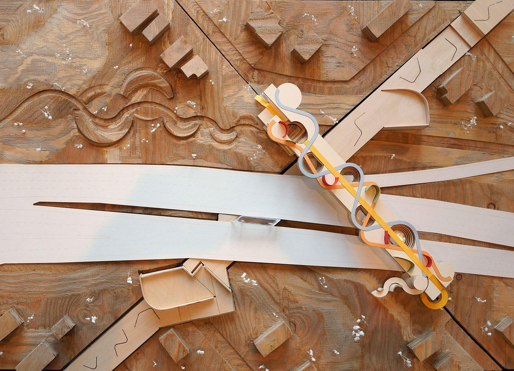 Plan of buildings and relationship between the moving pool and pedestrian path. The pool moves slowly enough for pedestrians to walk on and off as it rolls