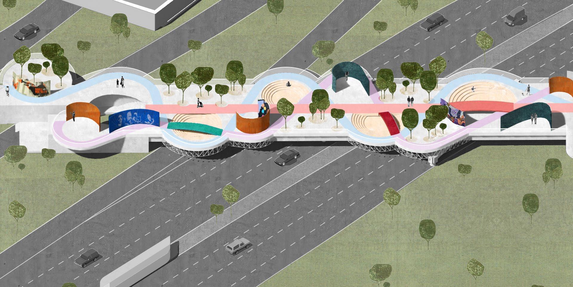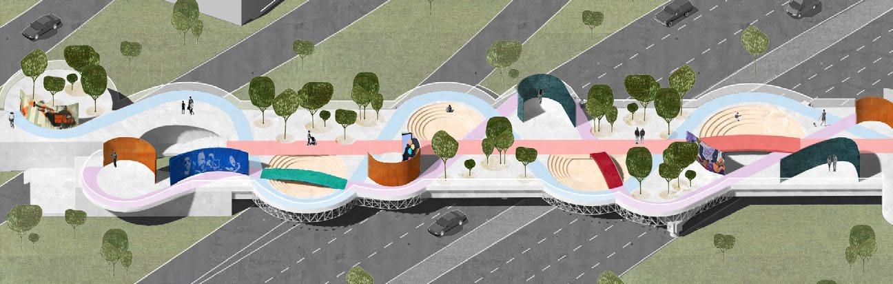 Overall axon and above-ground bridge configuration. The bridge combines public entertainment spaces such as amphitheaters and small stages with public art display walls for local Nashville artists.