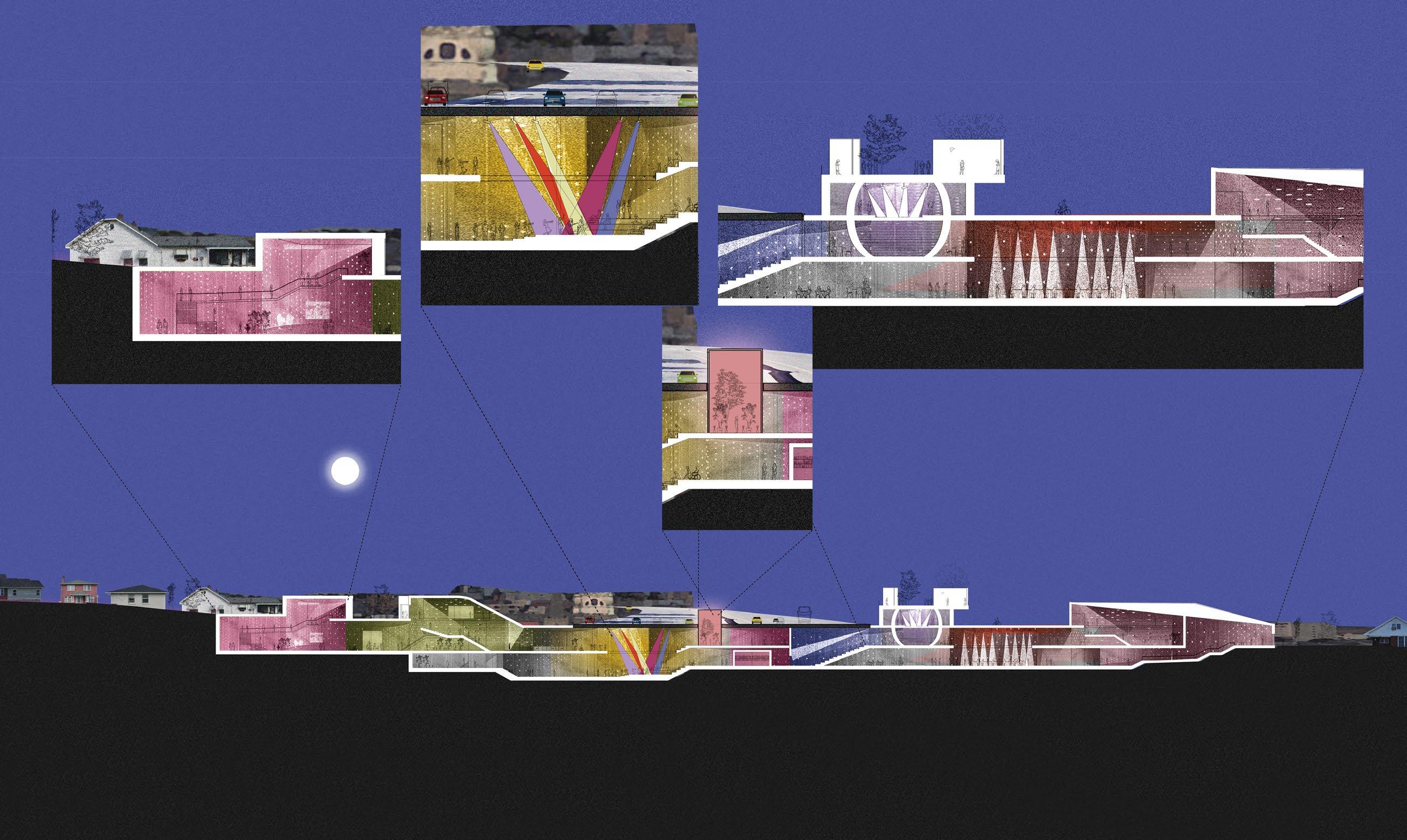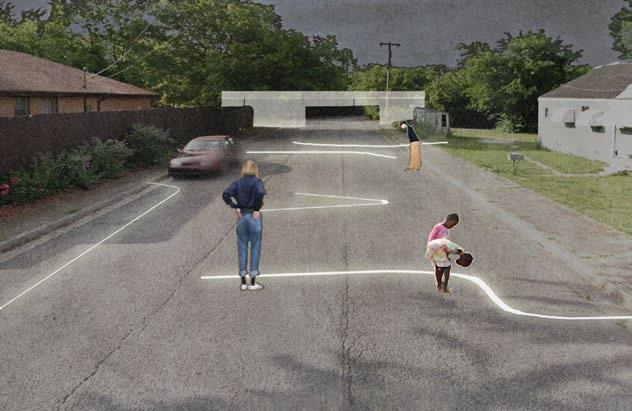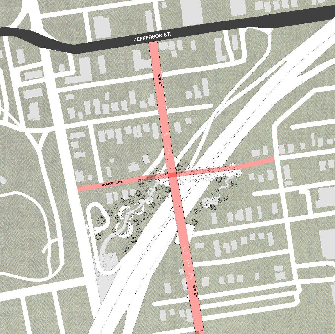 This intervention is organized into three areas through a parti that forms an ‘X’ where 27th Ave and Alameda Ave once intersected. Programs include performance spaces, recording studios, gathering areas, gardens, and spaces for walking, resting, and collaborating, all with the aim of bringing back businesses that were displaced.