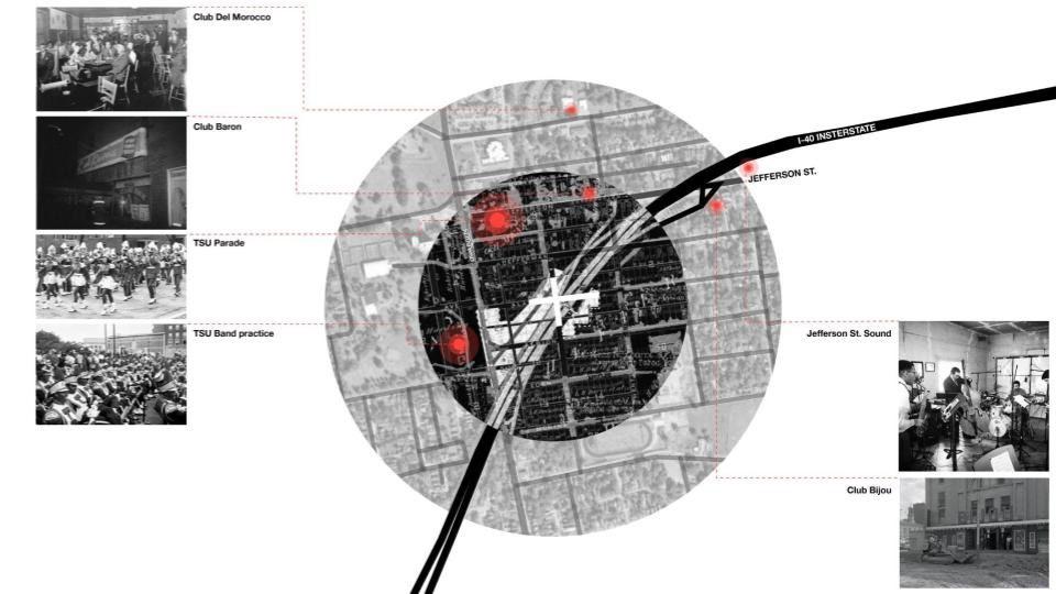 Research diagram illustrating the demolished Nashville roads and displaced businesses surrounding the once-prominent Jefferson St