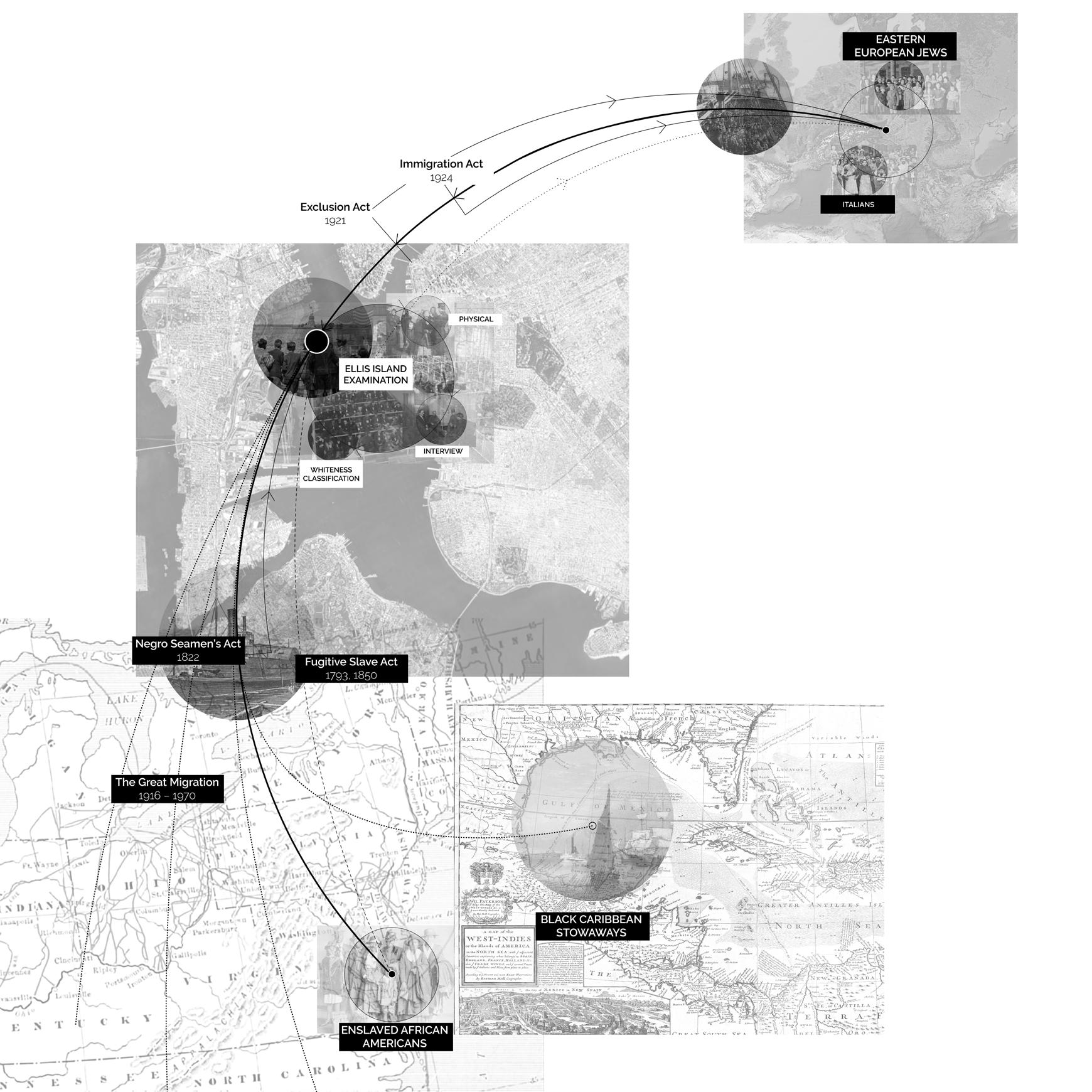 Site research on Ellis Island as a controlled boundary to become ‘American.’