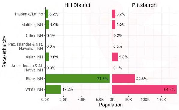 In 2019, just over 7,000 (about 72 percent) of Hill District’s population identified as Black,non-Hispanic/Latino