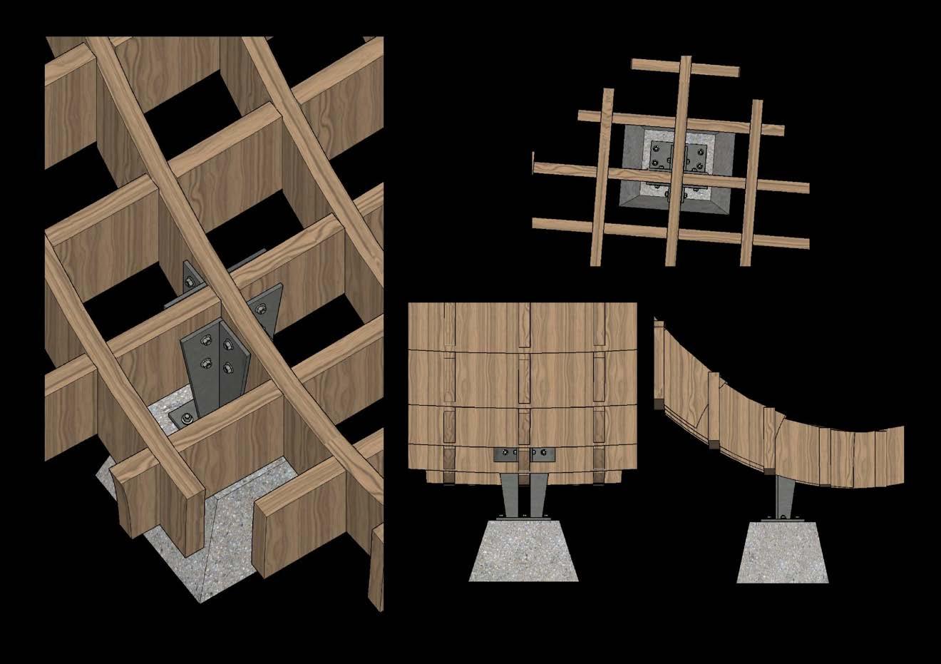 Its framework adopts a waffle configuration, ensuring seamless interconnection of each element and reinforced with durable metal plates. The chosen material is prefabricated glue-laminated timber treated with a polyurethane coating, elevating its ability to withstand the diverse outdoor weather conditions.