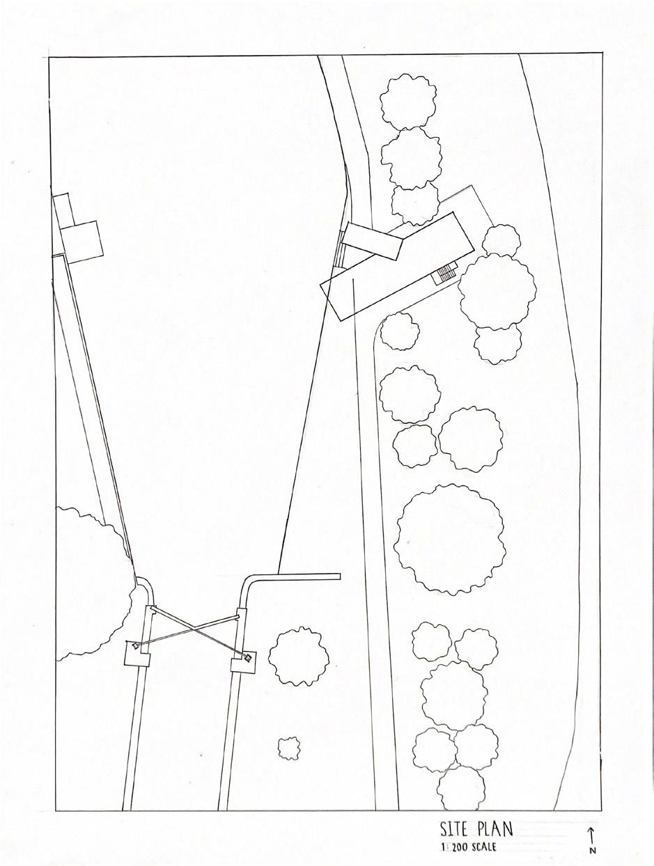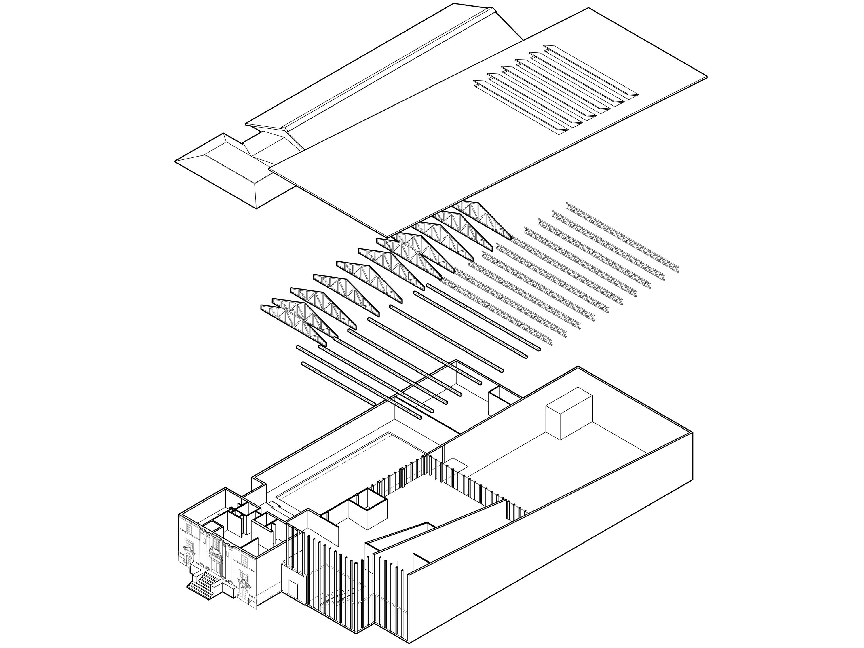 Flanking the a-frame at the center are intricate “butterflyshaped” roofs that contain the additional program spaces.
