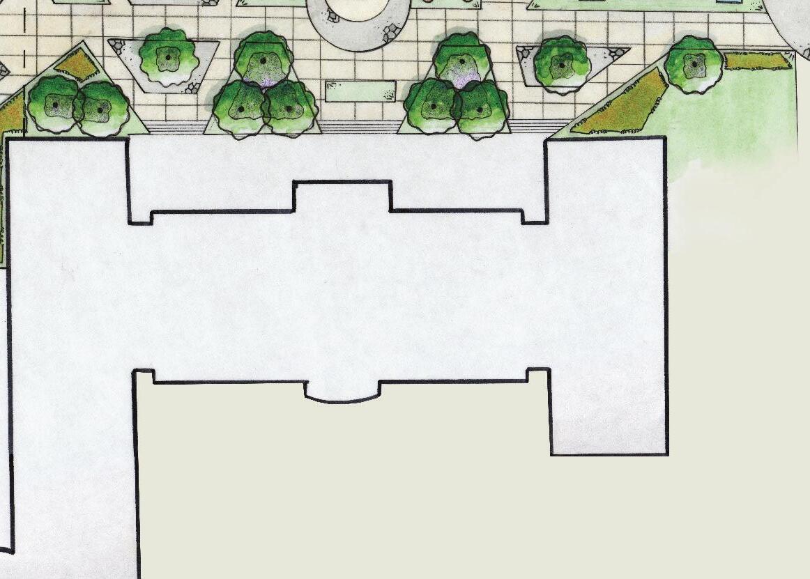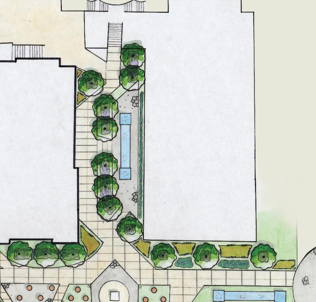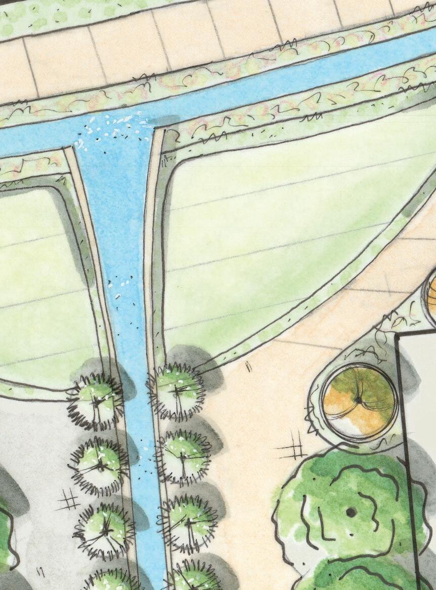 This design embraces abstraction, balancing direct pathways with irregular, eye-catching spaces that introduce intrigue and excitement to a busy spot on campus through unique shapes, fountains, and dynamic gathering areas.