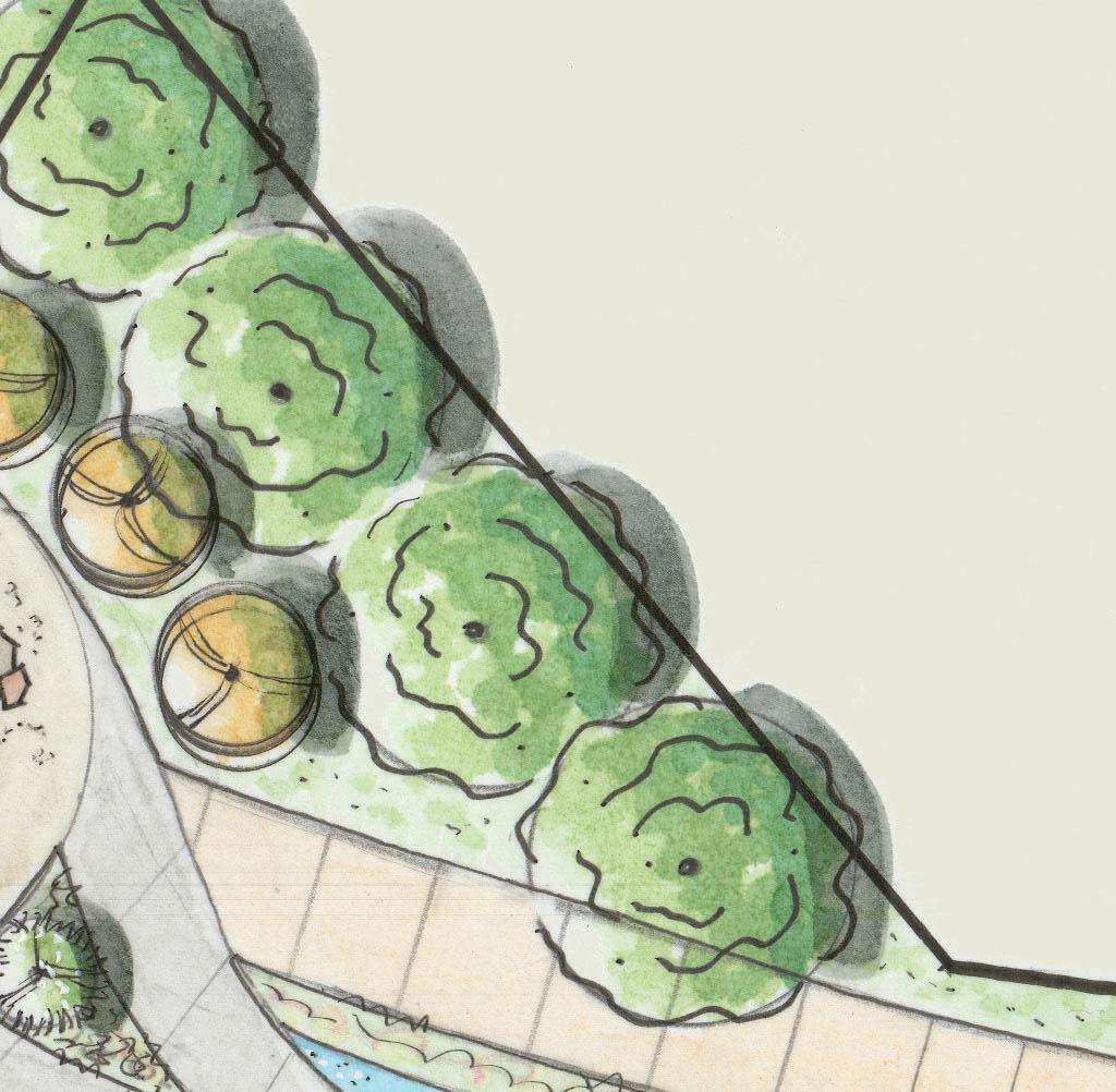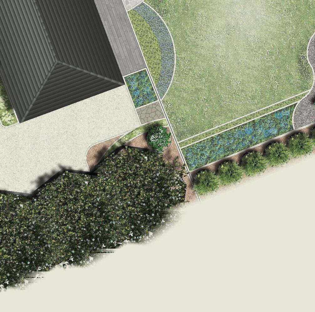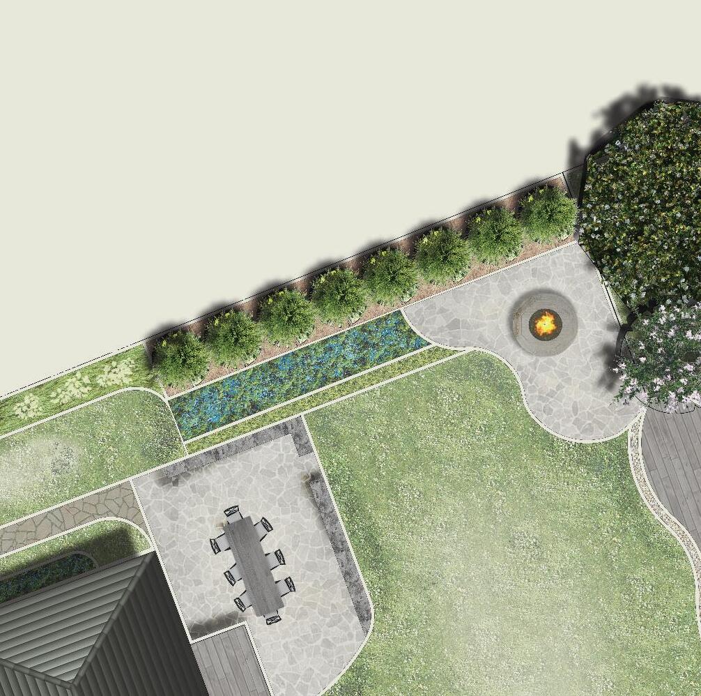 Creating privacy, through a traditional aesthetic, while remaining open and airy were three objectives of this redesign. Thuja giants are used along the back sides paired with southern magnolias in the front for privacy. Hydrangeas and pampas grass act as accents to keep with the traditional, southern aesthetic, and the vast part of the lawn is manicured as open space for activity and an open flow throughout the landscape.