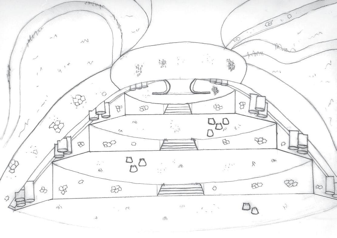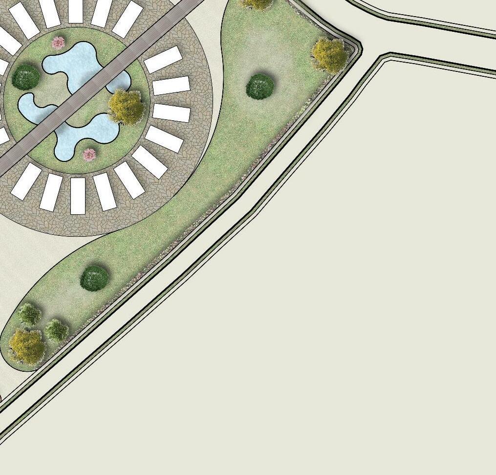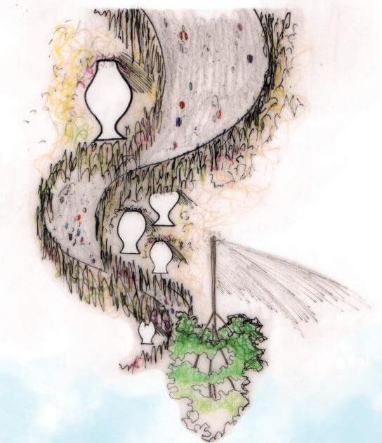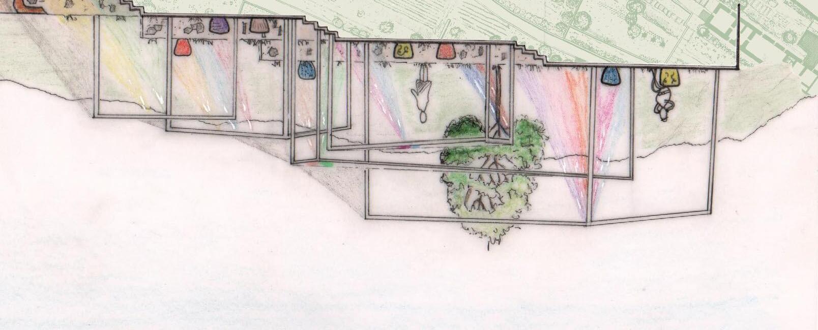 Inspired by local ceramicists, and tasked to create a space that “reinvigorates and celebrates art in Cortona,” I have designed an area that facilitates creativity, highlights local ceramicists’ artwork, and allows for a place of gathering and relaxation in a beautiful setting of art itself. Set on the ‘Basolata del Ghiandea’, one of the driest, sunniest, and undisturbed areas in Cortona, I was provided with an abundance of opportunities to create a place of art and creativity. To encourage traffic through the site, I have added large shade structures upon newly leveled grounds, creating a rare retreat from the hot sun in such an exposed atmosphere. Within these shade structures, consist of stained glass mosaics, designed by a local artist, that reflect upon the grassy grounds forming beautiful mosaics throughout the space. In order to emphasize this hidden paradise, I have also brought water to the desert site and created a sort of oasis, or escape. Channels run along the terracing, flowing into one large ceramic well inspired by Etruscan pottery. Paths on either side of this site act as a ceramic garden walk through, for local ceramicists to display their work on a cycle, in a site 100% designed to highlight their artform. This ceramic escape will encourage people to explore local artists while retreating to a one of a kind mosaic oasis.
