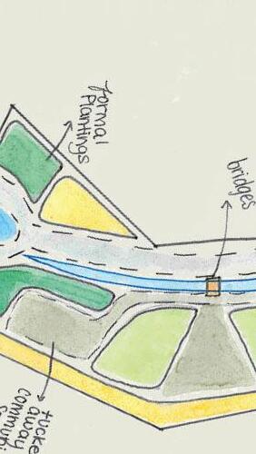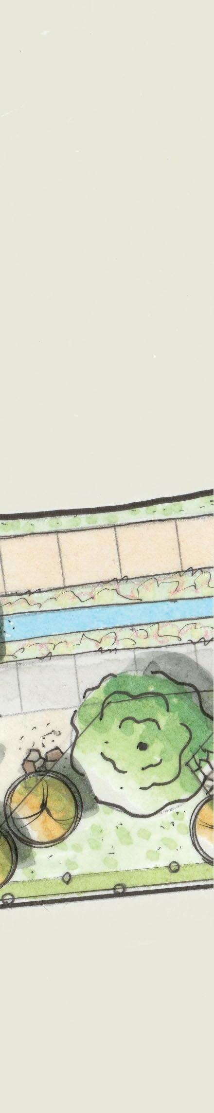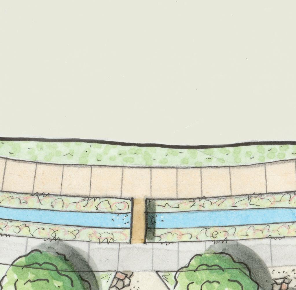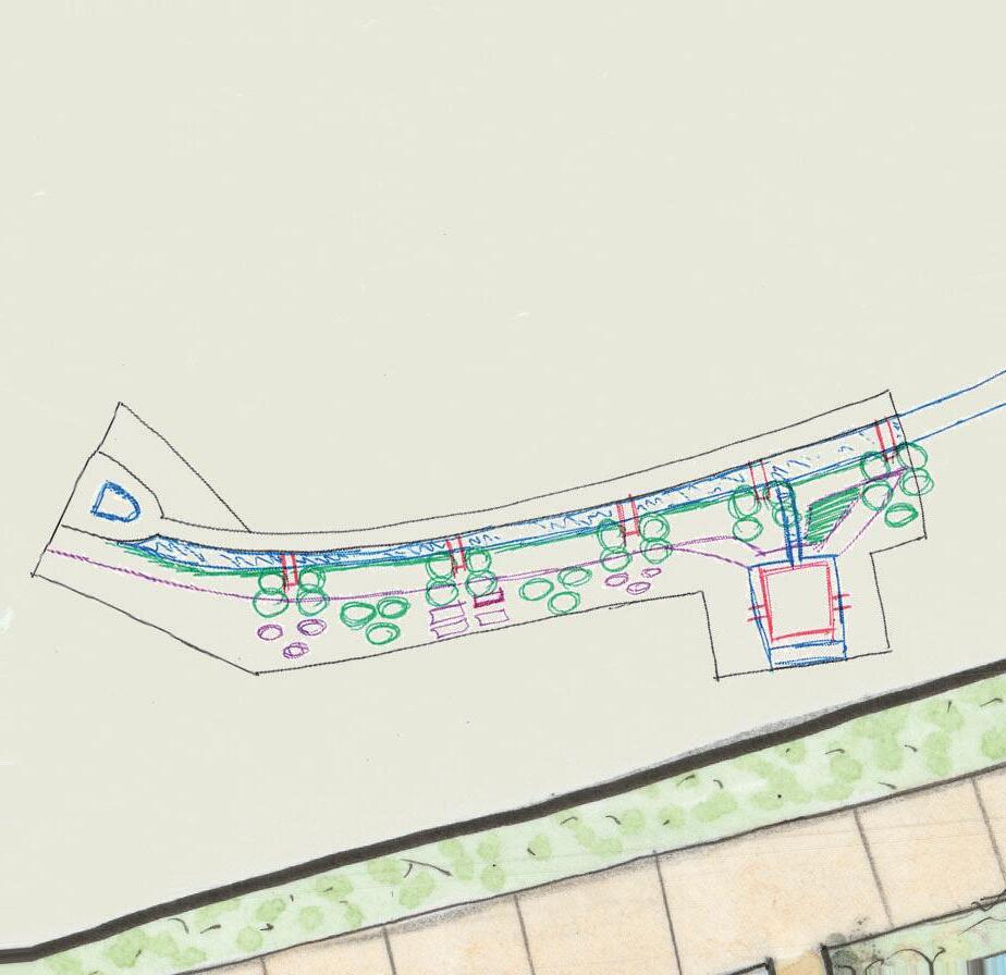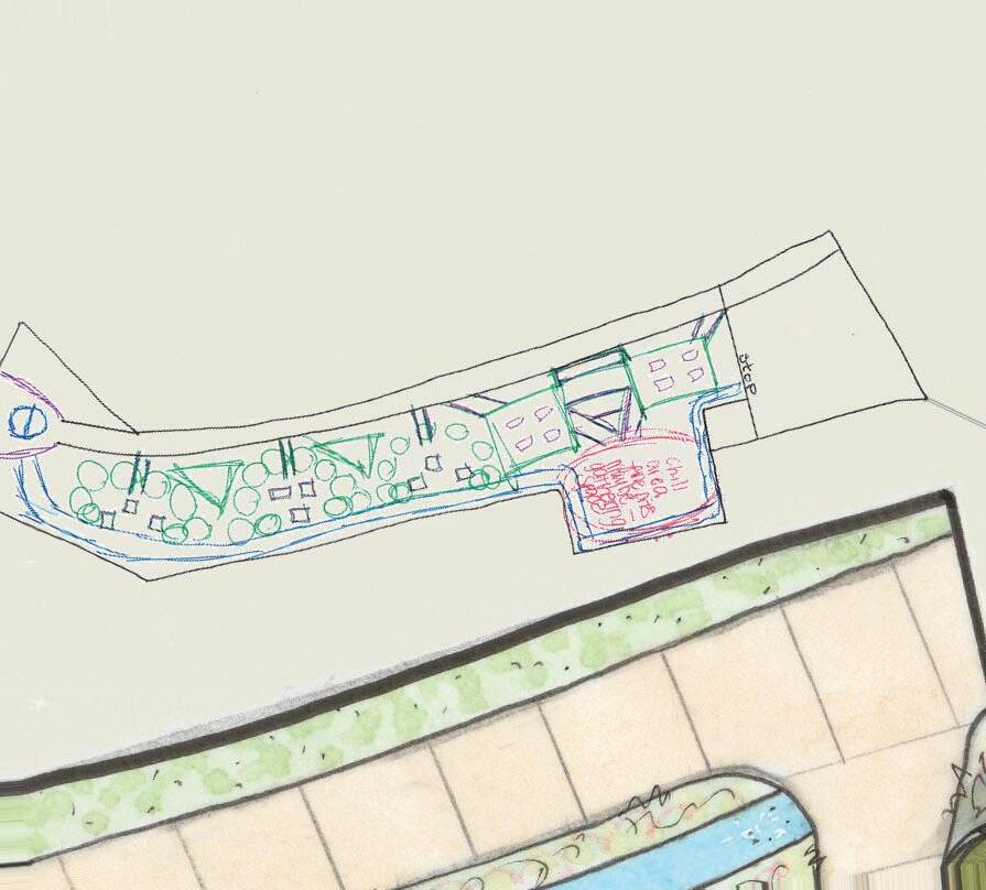The name Firefly Trail alludes to a whimsical, hidden forest, secret garden, but the area itself does not relate. My goal in this redesign was to create a space that felt like you were walking through a whimsical forest with running streams, hidden seating areas, and good vibes all around. At the start of the trail, you’re greeted by a gentle fountain, and given the option to take either the path to the left, or the path to the right, which leads you to the hidden alcoves. In the middle runs a stream with bridges overtop to connect the two seperate walkways. As you continue through the space, you reach a terraced plaza where one can sit and relax by the running water, as well as a water feature all the way at the top which acts as a larger gathering area with tables and open space.