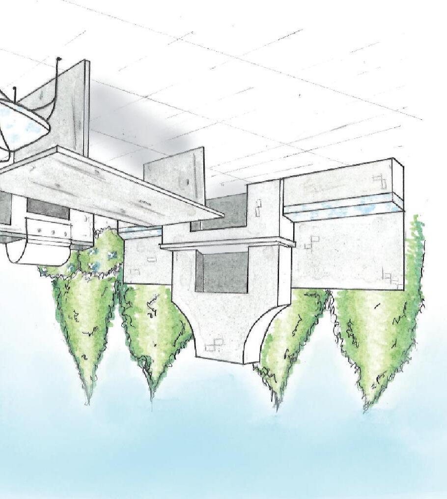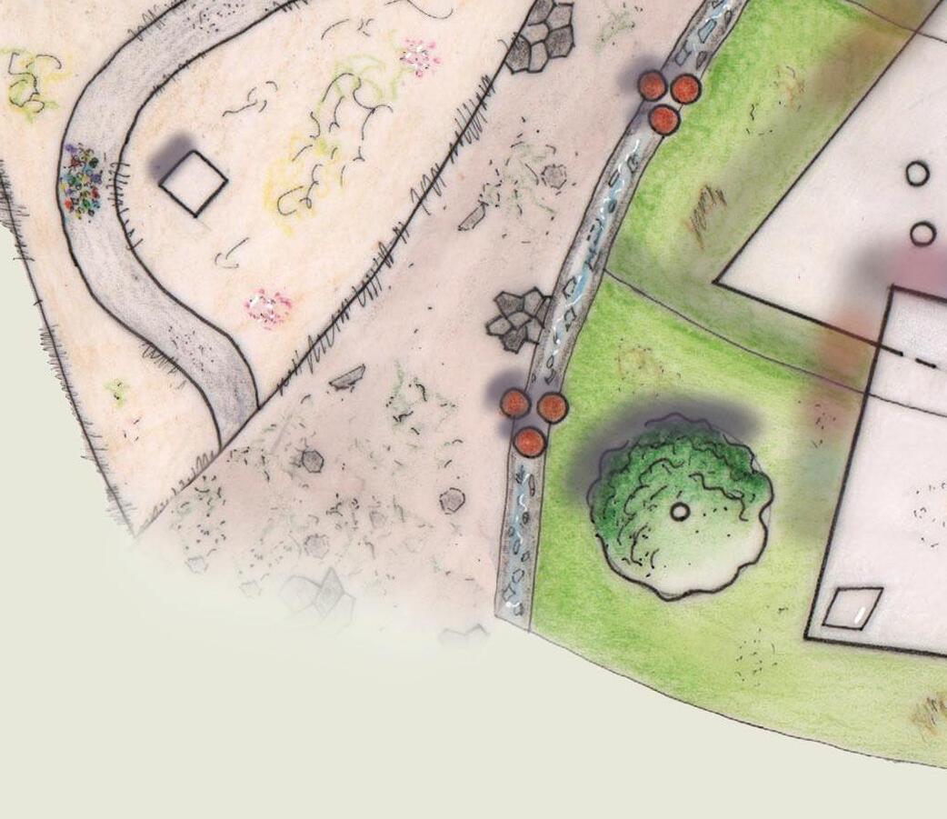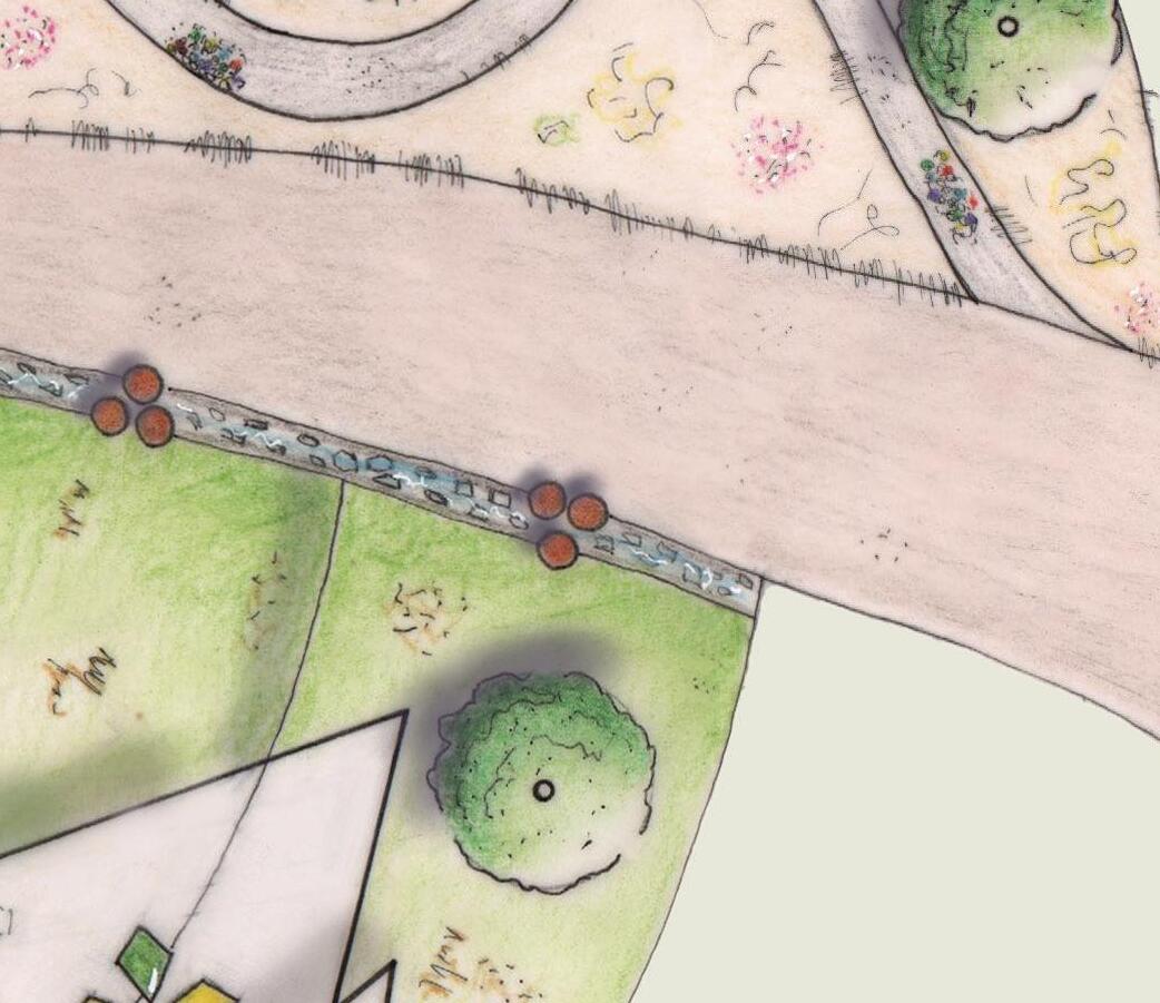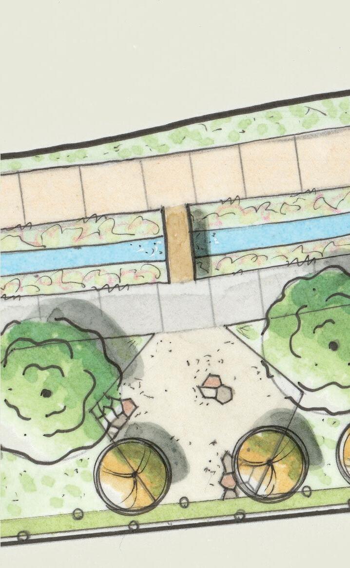 The name Firefly Trail alludes to a whimsical, hidden forest, secret garden, but the area itself does not relate. My goal in this redesign was to create a space that felt like you were walking through a whimsical forest with running streams, hidden seating areas, and good vibes all around. At the start of the trail, you’re greeted by a gentle fountain, and given the option to take either the path to the left, or the path to the right, which leads you to the hidden alcoves. In the middle runs a stream with bridges overtop to connect the two seperate walkways. As you continue through the space, you reach a terraced plaza where one can sit and relax by the running water, as well as a water feature all the way at the top which acts as a larger gathering area with tables and open space.