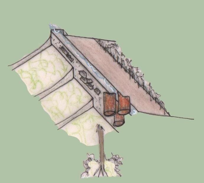 Runnels along the terracing collect water and direct it down to the well. Pots across them act as stepping stones to enter the different terraces