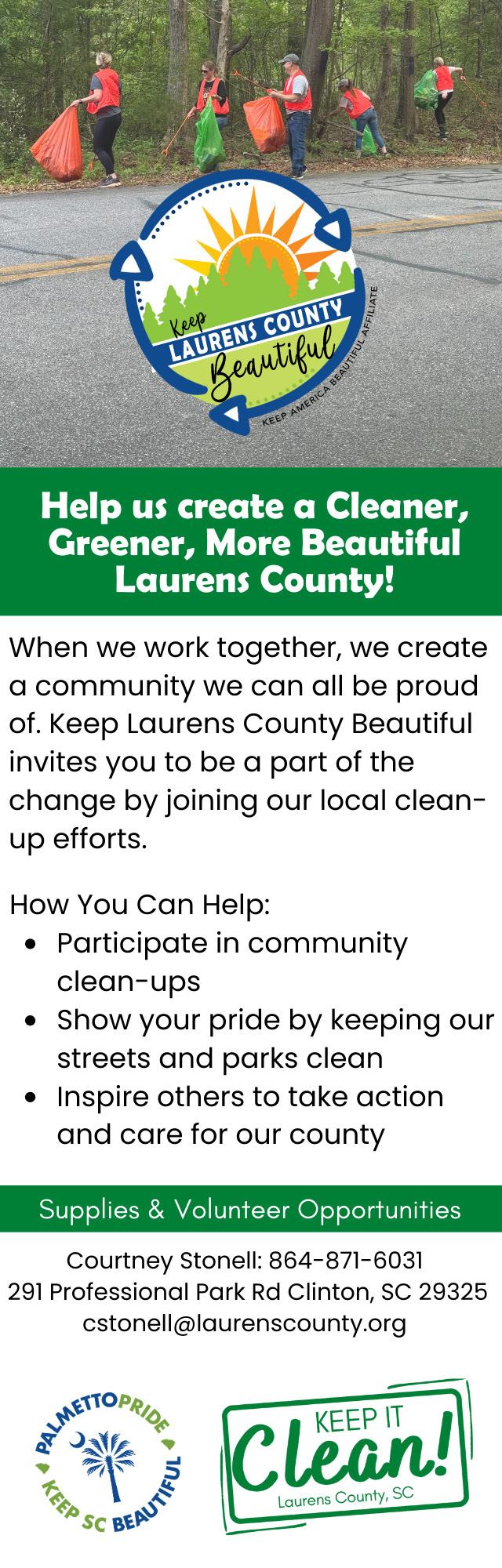 Laurens County is gearing up for an exciting year of celebration in 2026. Since 2019, the Laurens County Revolutionary War 250th Committee, appointed by the County Council, has been diligently planning engaging events and experiences for residents and visitors alike. In collaboration with the Laurens County Trails Association and Laurens County Cycling Club, the committee has developed an online mapping system for cyclists, showcasing Revolutionary War skirmishes and battle sites. Visit laurenscounty250.com for more info.