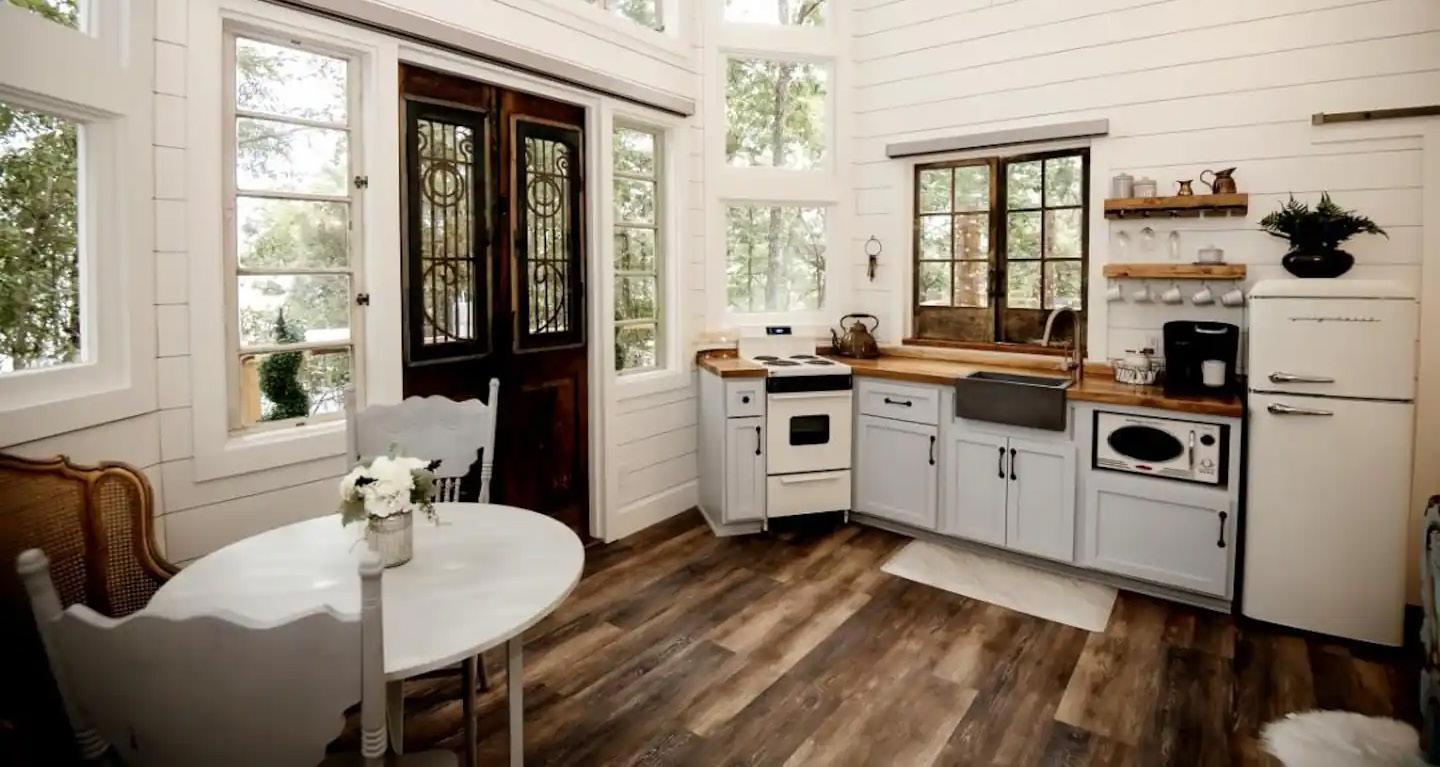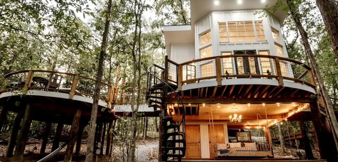 The treehouse itself is a unique blend of rustic charm and modern amenities. Unlike the off-thegrid treehouses they’ve visited, Aaron and Kristin wanted to offer a place where guests can still enjoy comforts like cooking, showering, and soaking in a hot tub. Designed by Kristin and crafted by Treehugger Customs, the treehouse exudes French provincial style, complete with antique pieces Kristin personally selected, including French doors from Turkey and a spiral staircase from Bob Jones University. Building it came with challenges, like drilling through rock to secure its foundation, but this only made their retreat feel even more special.