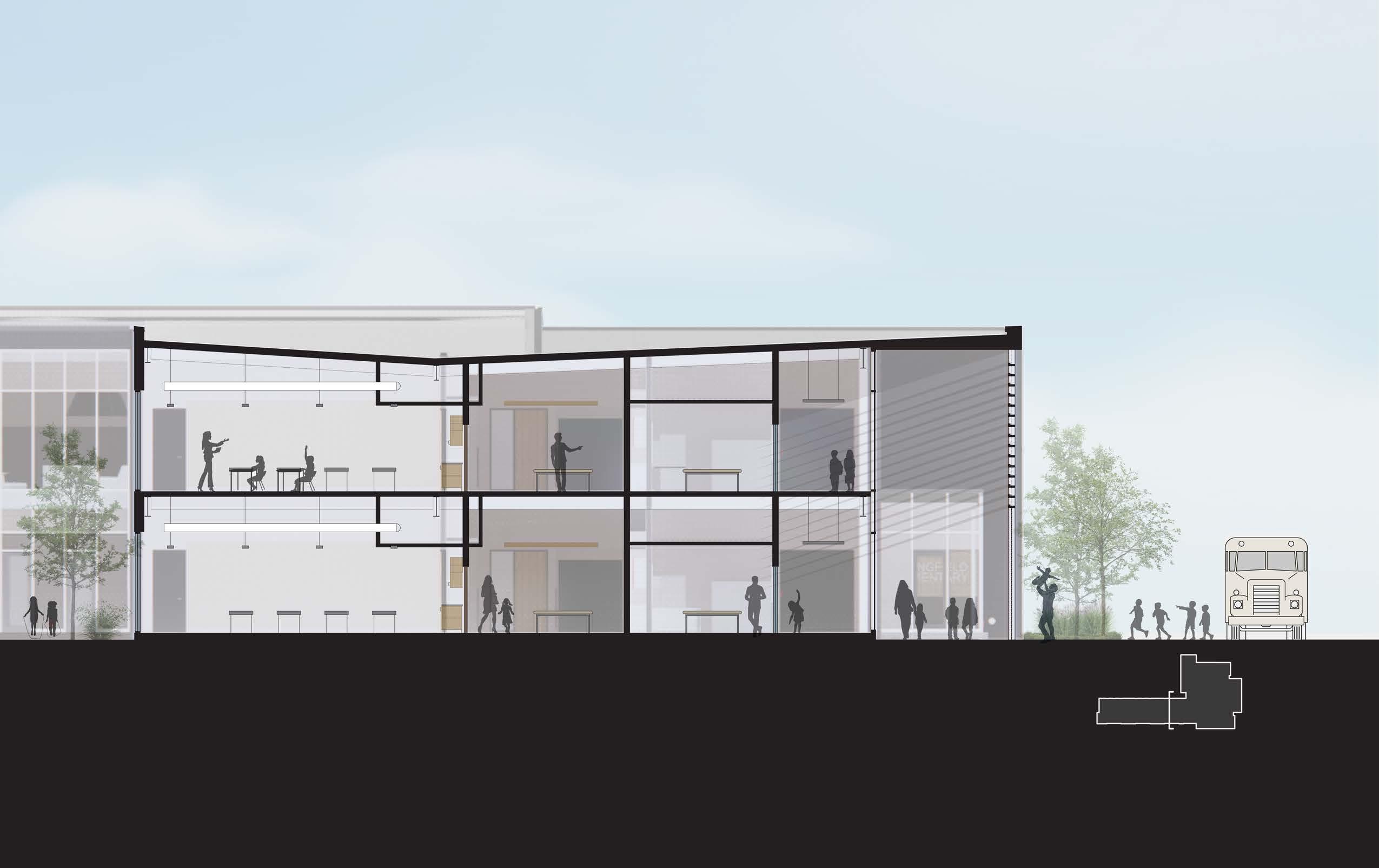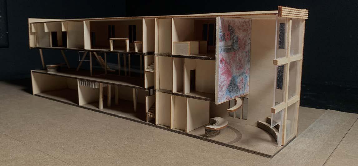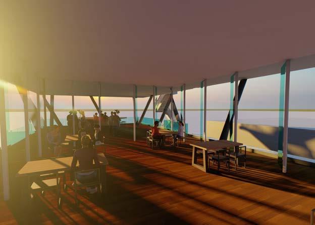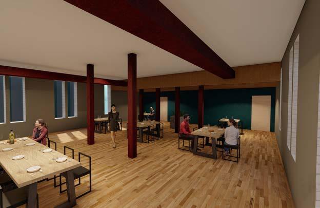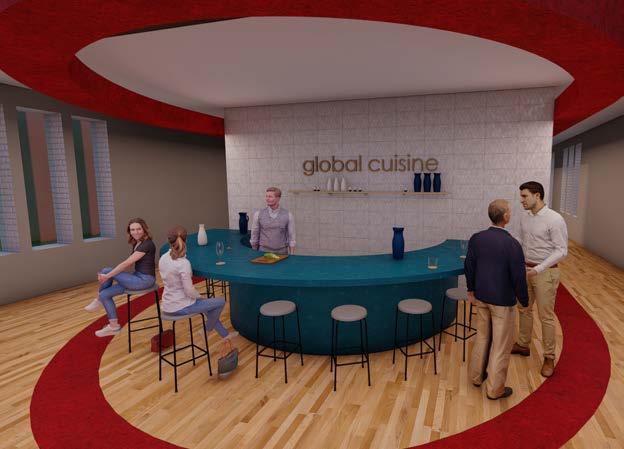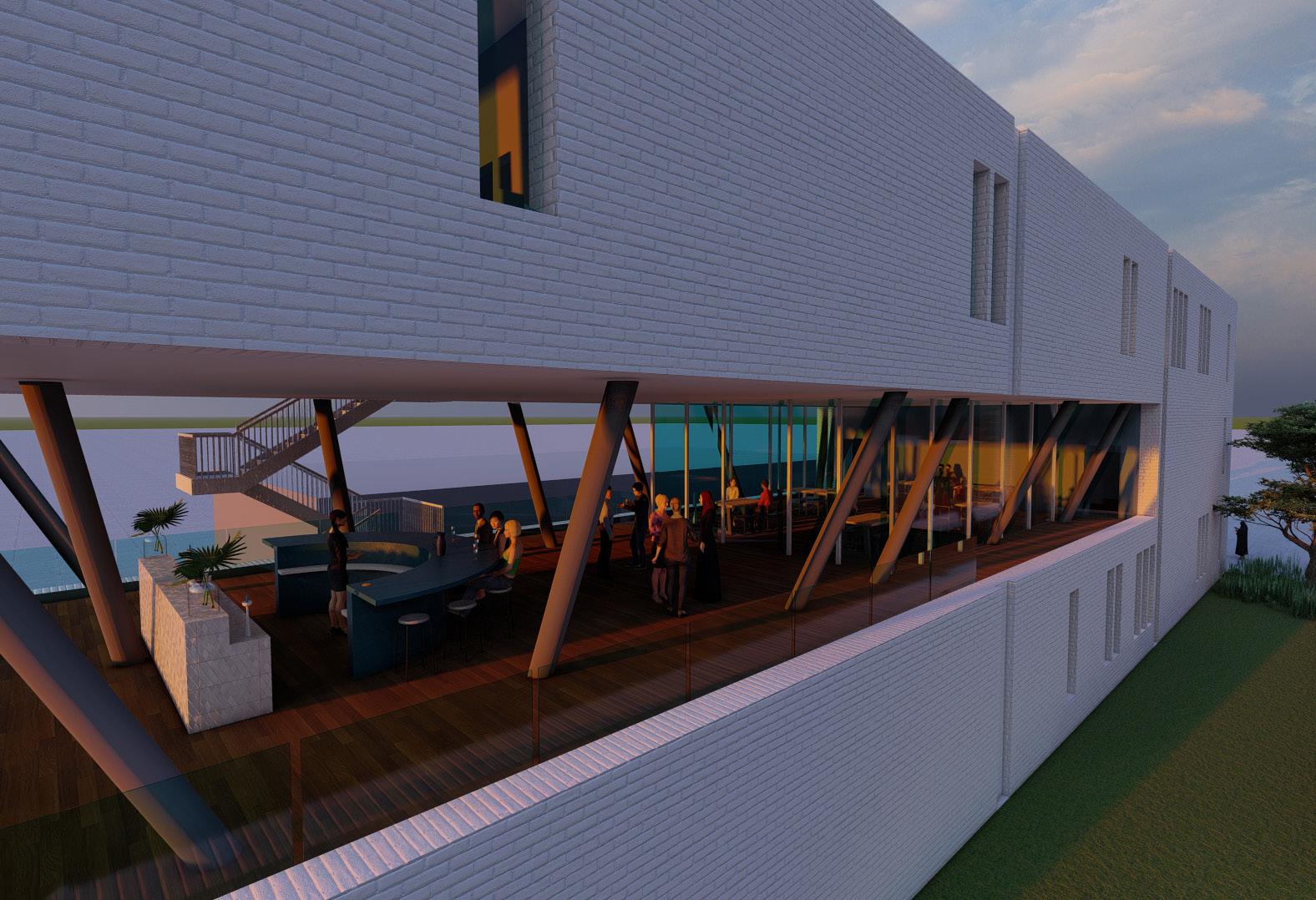 The goal of this project was to create a restaurant and living quarters for traveling chefs. The building has three levels. Level one contains the restaurant and kitchen space, level two is a partially outdoor and indoor event space, and level three is the apartment for traveling chef’s.