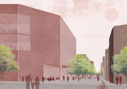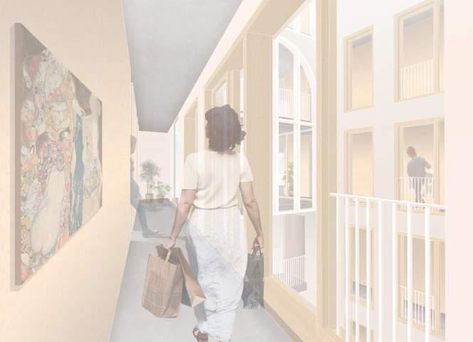 The proposition presented here aims to be respectful of the existing buildings, to offer a variety of units affordable to different kind of households, and to maximise the access to exterior space. The variations in storeys height is thought in order to open up the view and optimize sunlight gains in a way that accomodates the neighbouring configuration. The ground floor, reserved for commercial use and an art gallery, proposes an enlarged street mimicking the Board of Trade situation. A plaza is then created providing a welcoming space which marks the main entrance. The building is separated in two parts - two wings with different unit typologies joined by a central glazed connection. This split morphology provides the necessary space for a large semi-public internal courtyard, mindful of an eventuel extension towards the adjacent site. Terrasses are available for the café and the art gallery, and green areas are designed for the residents. Above the gallery, an enclosed playground for children works as an outdoors extension for the resident’s common area. Every apartment, be it a studio, a one or two rooms unit, is provided with a loggia oriented towards the courtyards.