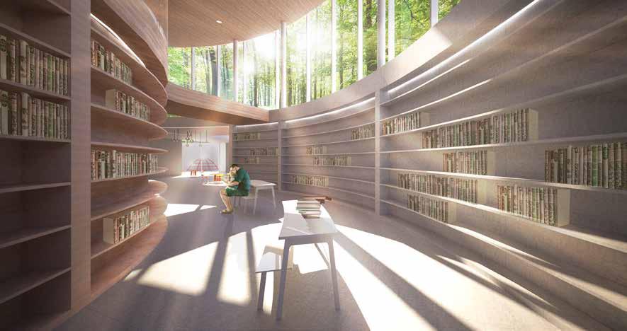 The program is split in two parts: the multimedia set on the ground floor sits on the undeground floor where the book collection lives. This situation achives two tasks. First, the architecture becomes a mean of mediation. With the site located in a park, the fully glazed multmedia platform, which hosts workshop spaces, creative spaces, café, news and media access, and a boutique, works as a direct connection between interior and exterior. The users can interact while enjoying the proximity of nature and the passerby is invited to peek in or come in for a while. Meanwhile, the bookshelves and study spaces are placed downstairs, in the deep and sheltered underground level providing the readers with a naturally lit, sanctuary-like area. Second, the architecture activates a symbolic and playful experience. While the multimedia platform is centered on the ground floor, the bookshelves follow the perimeter of the building. One one hand, the users above can have a look down at the users searching for a book. On the other, the bookshelves are the bearing structure of the platform; tradition becomes the base upon which technolgy stands.