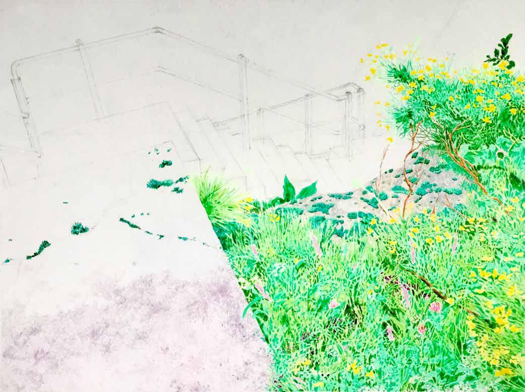 Définir le contenu latent des alentours is an idea born out of hundreds of contemplative walks in the city of Chicoutimi and the subsequent intention to explore the vast and elusive territory of memory. How does the immediate surroundings influence one’s visual imagination? What traces does it imprint on one’s mind? And then, what memory is kept or lost and how does the fragments come together? In an attempt to answer these questions, a series of urban perambulations was set up, each of them followed by a session of sketching focusing on architectural shapes. Elements of the drawings were later selected to generate four bas-reliefs. Assembled, the fragments (sometimes recognizable, sometimes not) appear as whole and new architectural entities. They become an autonomous representation of an original world, giving significance to an underlying content.