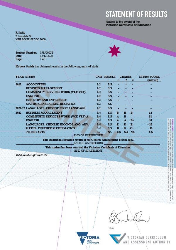 Students undertaking a Unit 1 & 2 VCE sequence will be graded internally, i.e. at the school level, but no results are recorded with VCAA and Unit 1 & 2 results do not contribute to the calculation of a study score or ATAR. Nonetheless, students must satisfactorily meet the learning objectives of a subject according to VCAA guidelines. An S for Satisfactory Completion will be recorded by VCAA. Alternatively, if a student fails to meet the learning objectives/outcomes of a study, they will receive an N for the unit, and this is recorded by VCAA.