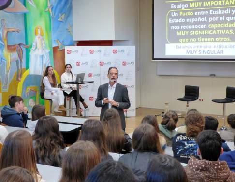 Guillermo Dorronsoro participa en este ciclo de conferencias desde 2023, habiendo cogido el testigo de Pedor Luis Uriarte, con alumnos y alumnas de segundo de Bachiller, explicando el Concierto económico vasco y el cupo. Explicó al alumnado que ya había trabajado el tema previamente, la historia y trayectoria de este pacto económico, sus derechos y ventajas, y por qué debemos defenderlo y protegerlo