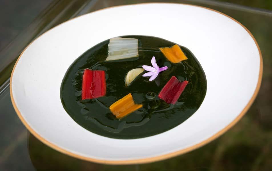⮕ Plateraren hondoan zerbaren hostoekin lortutako purea jarri. Jarri koloretako zurtoinak, purearen gainetik 3 edo 4 zm-ko zatitan moztuta (2 zurtoin gorri, 2 hori eta 2 zuri) eta erdian baratxuri-ale bat jarri, gainetik, hauek konfitatu ditugun oliba-olio zurrusta bat botaz.