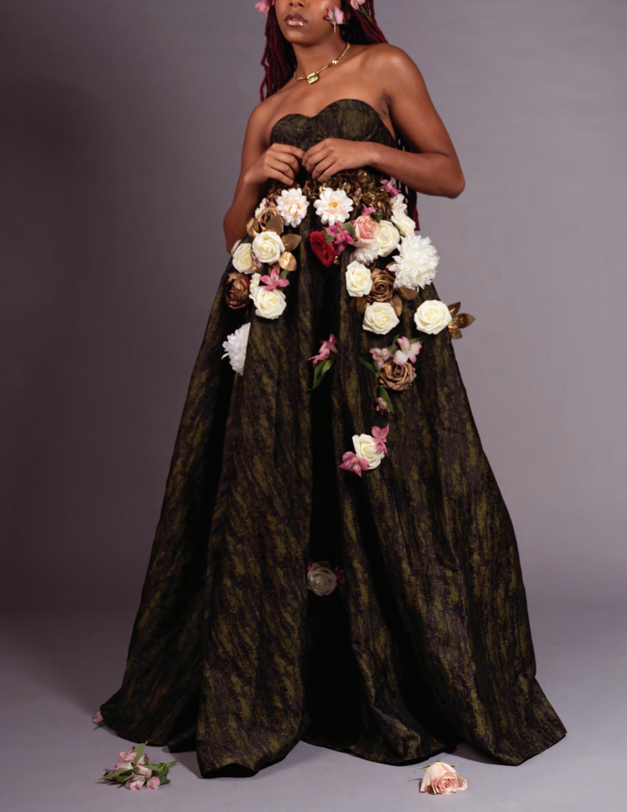 Inspired by his adobe in the Ríona Realm, Prometheus’ gown captures the essence of Chloris, his door, and garden that are spoken in urban legends. The jacquard recalls the moss growing alongside Prometheus’ great tree, flowers in his endless fields, and butterflies that are sent to his love, Cordelia, Goddess of the Seas. While each door is different for each god, Prometheus’ door is a arch of trees, plants, and vines braiding into one another.