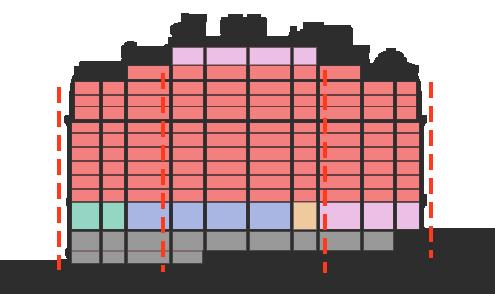 El proyecto se eleva en 11 pisos, su primer piso consolida comercios, mientras que la segunda planta ordena el hall y servicios hoteleros. El tercer piso queda relegado a un estacionamiento de tipología planta abierta, mientras que los pisos restantes son dormitorios de hospedaje.