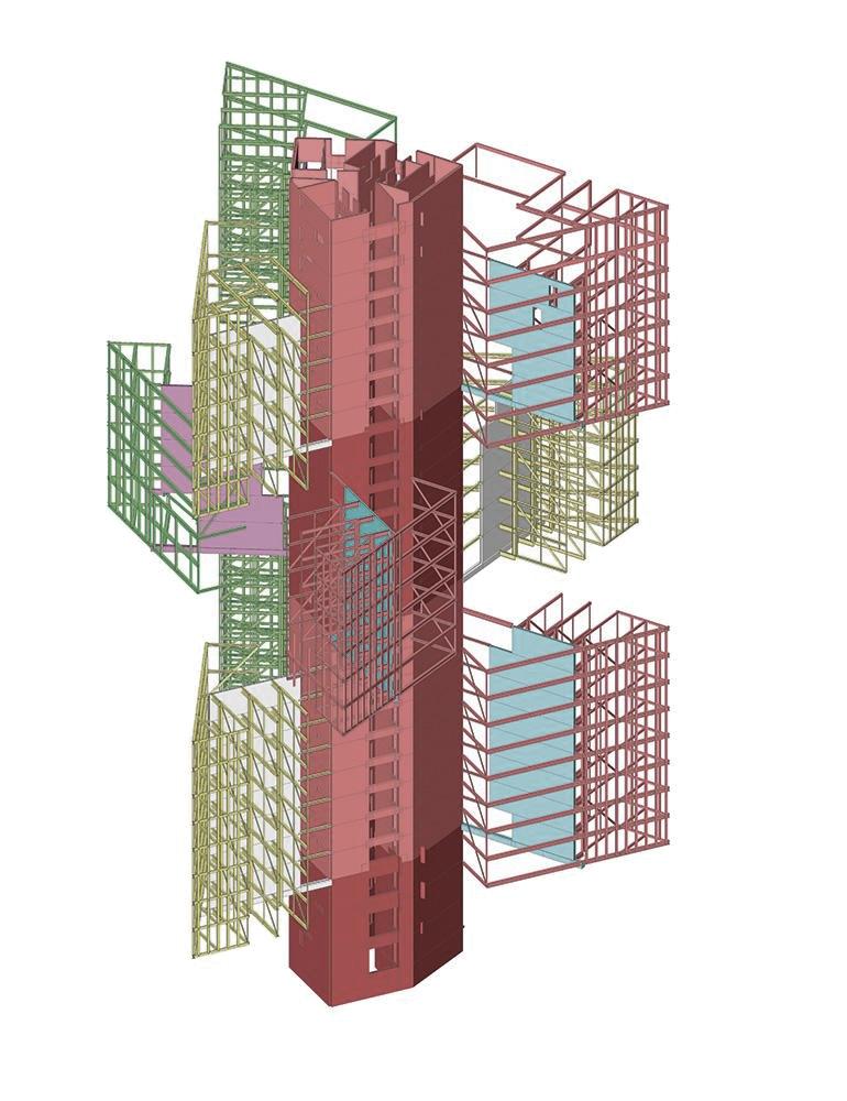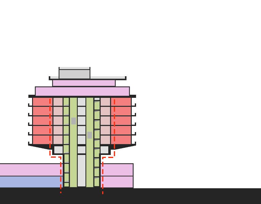 La obra, en su punto de reajuste, ya presentaba las fundaciones para el difunto rascacielos. Son reutilizadas entonces para esta nueva propuesta cuyo gran parte de su volumen está en volado, gracias a un sistema de muros portantes concéntricos que caen y se apoyan sobre el sistema de fundaciones previamente mencionado. La circulación vertical queda relegada dentro de este núcleo estructural, con una rampa que asciende en una suerte de promenade. Por la poca superficie del proyecto, sus dormitorios resultan incómodos y toscos, y al no ser ampliable por el sistema estructural poco convencional, no aportó mucho éxito tras su inauguración.