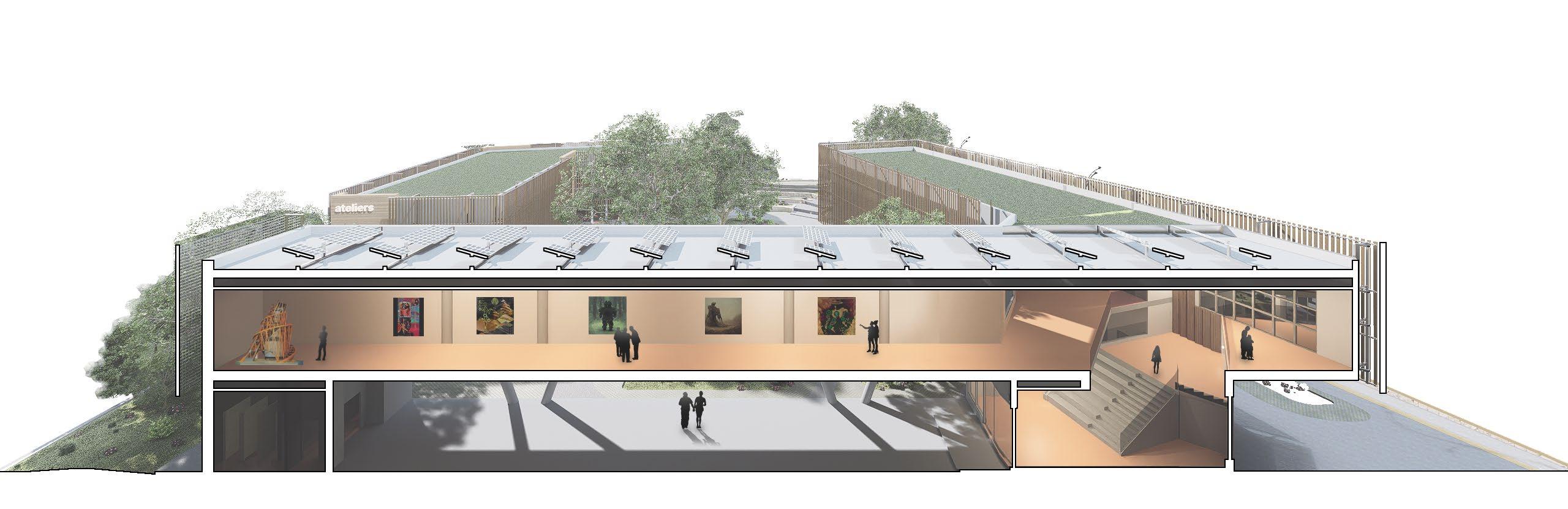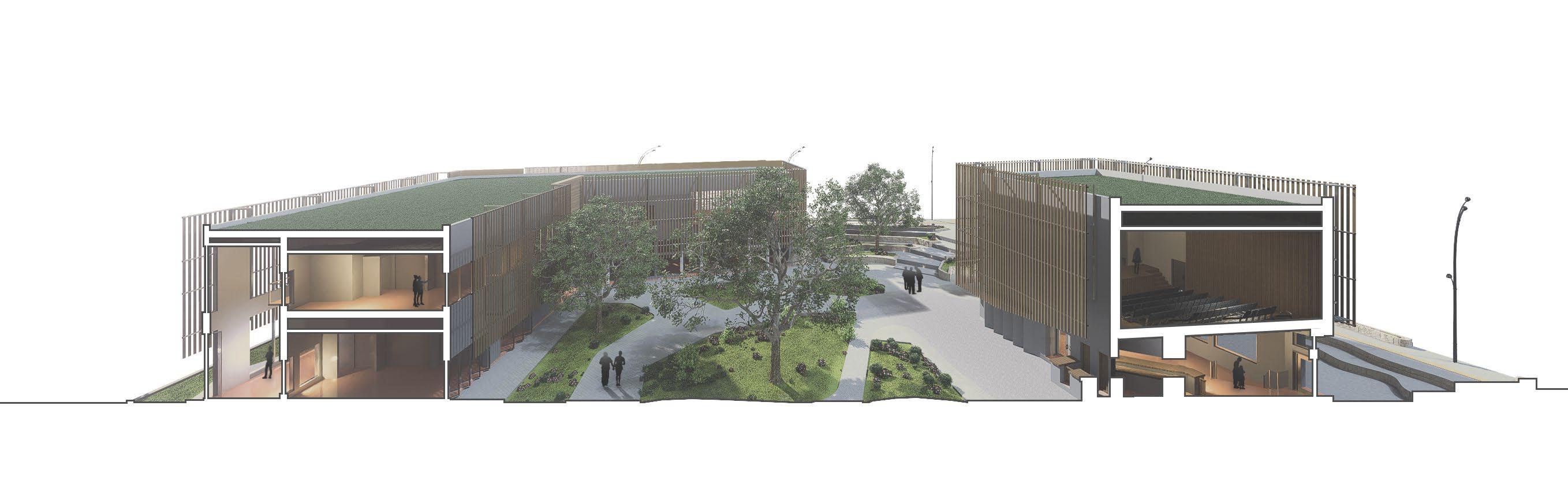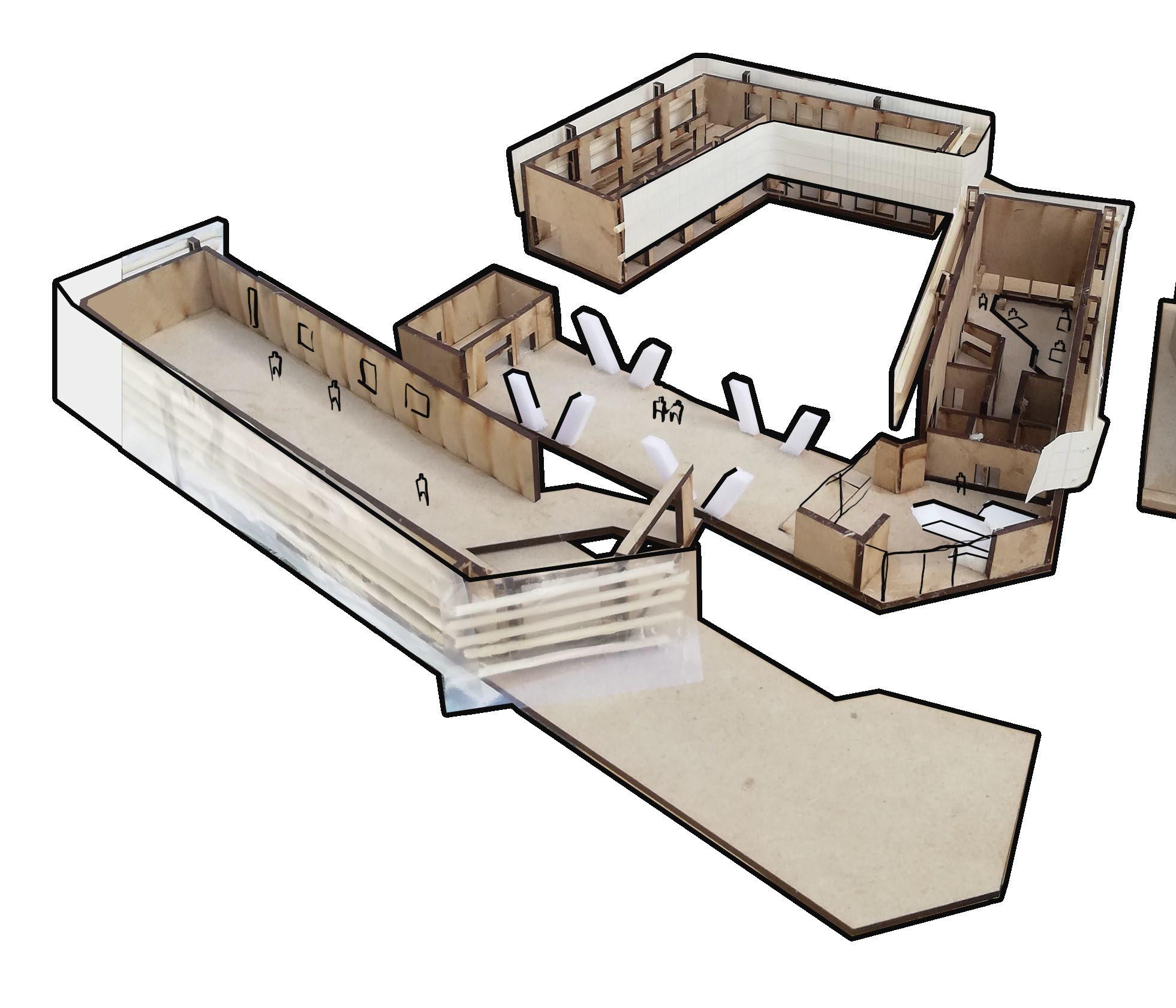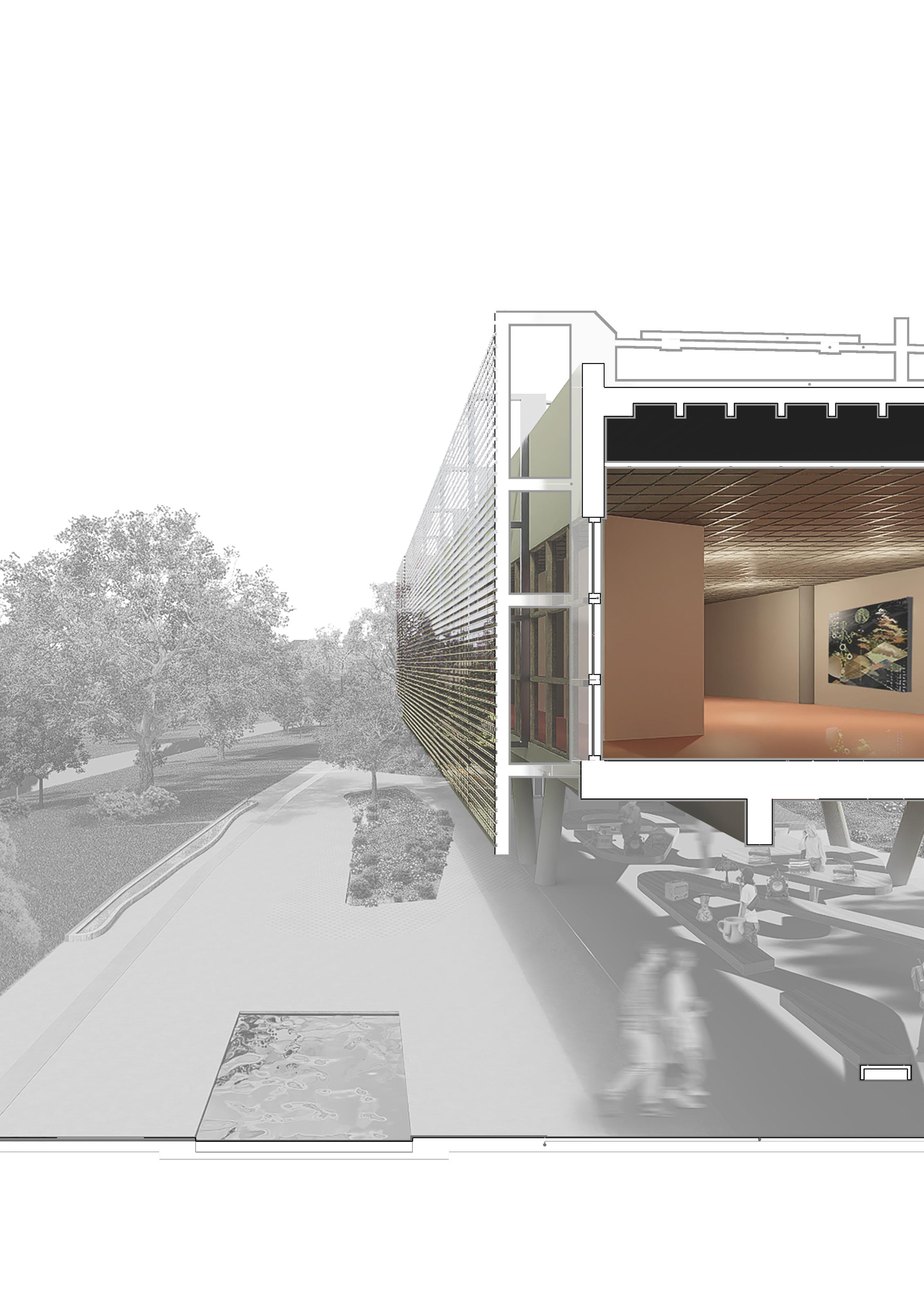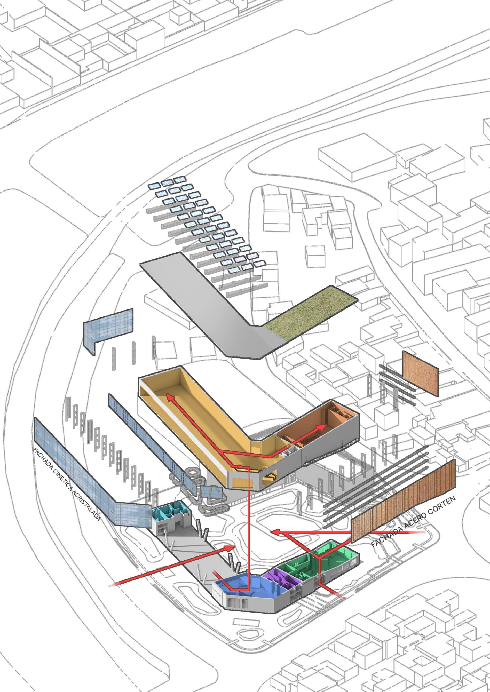 The project is defined by an order of different typologies and use systems, each serving a particular function. Yet articulated and related by their main objective, cultural recreation. This spaces reflect back through the main courtyard, communicating the different volumes of the cultural center. Ateliers, exhibitions halls, auditoriums, fairs, libraries; all elements forming a true cultural citadel.