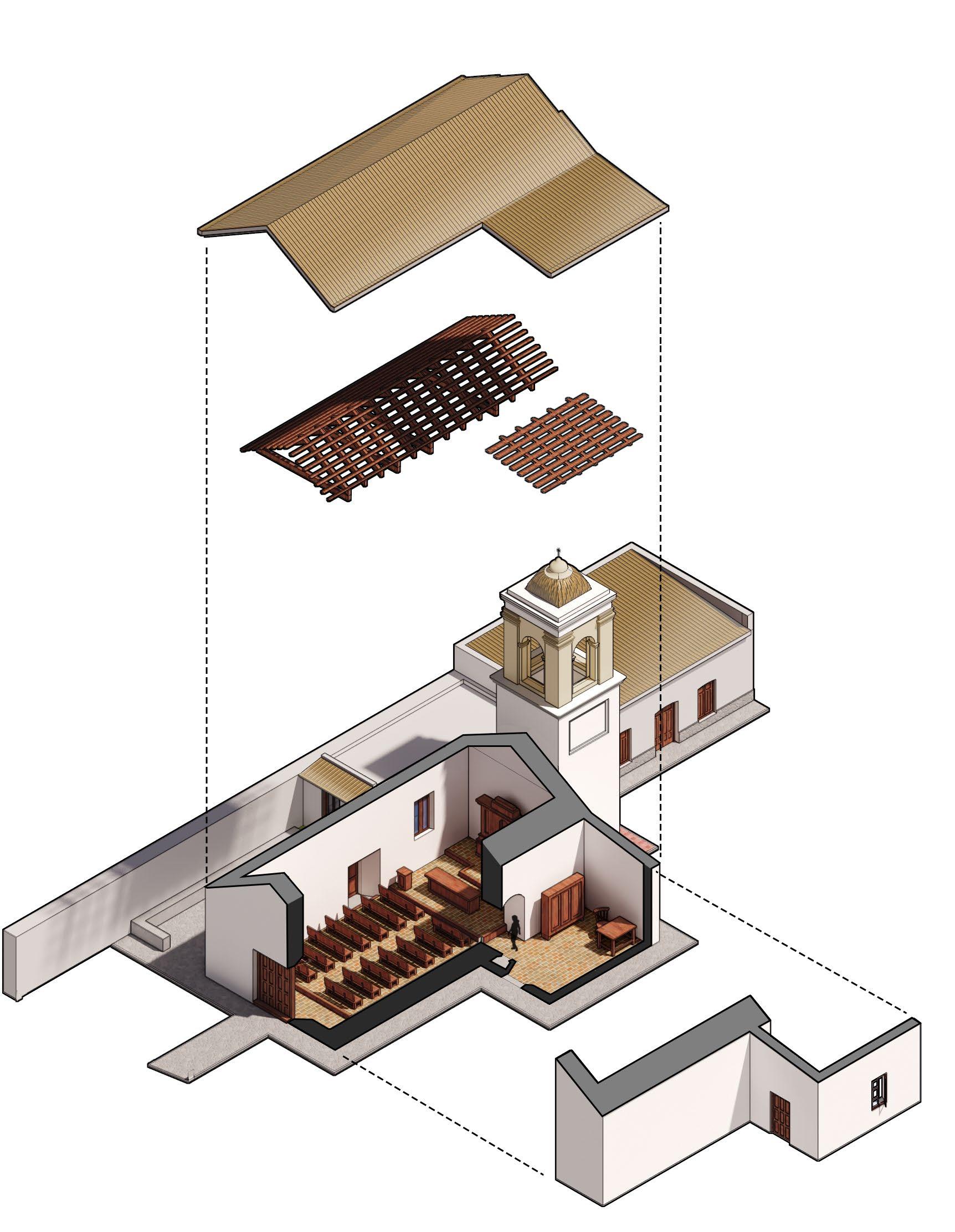 The Oratorium is located in the municipality of Valle Viejo in the Catamarca province; constructed in the late XIX century. It shows typical characteristics of the “Colonial” style; brick construction, red tiled roofs, white painted facades; and not a lot of appertures. At the moment of considering it national heritage; no plans or documentation of it existed. It had to be registered and measured, to afterwards create a digital re-creation of the edifice.