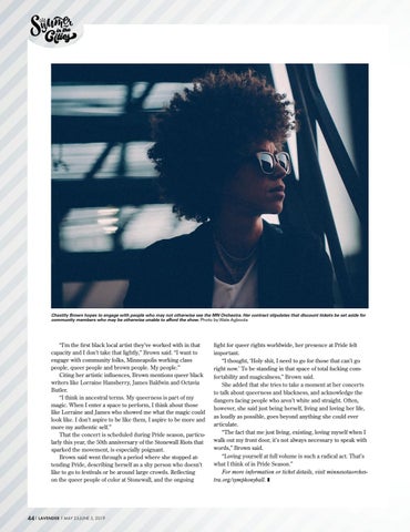 fight for queer rights worldwide, her presence at Pride felt important. “I thought, ‘Holy shit, I need to go for those that can’t go right now.’ To be standing in that space of total fucking comfortability and magicalness,” Brown said. She added that she tries to take a moment at her concerts to talk about queerness and blackness, and acknowledge the dangers facing people who aren’t white and straight. Often, however, she said just being herself, living and loving her life, as loudly as possible, goes beyond anything she could ever articulate. “The fact that me just living, existing, loving myself when I walk out my front door, it’s not always necessary to speak with words,” Brown said. “Loving yourself at full volume is such a radical act. That’s what I think of in Pride Season.” For more information or ticket details, visit minnesotaorchestra.org/symphonyball.