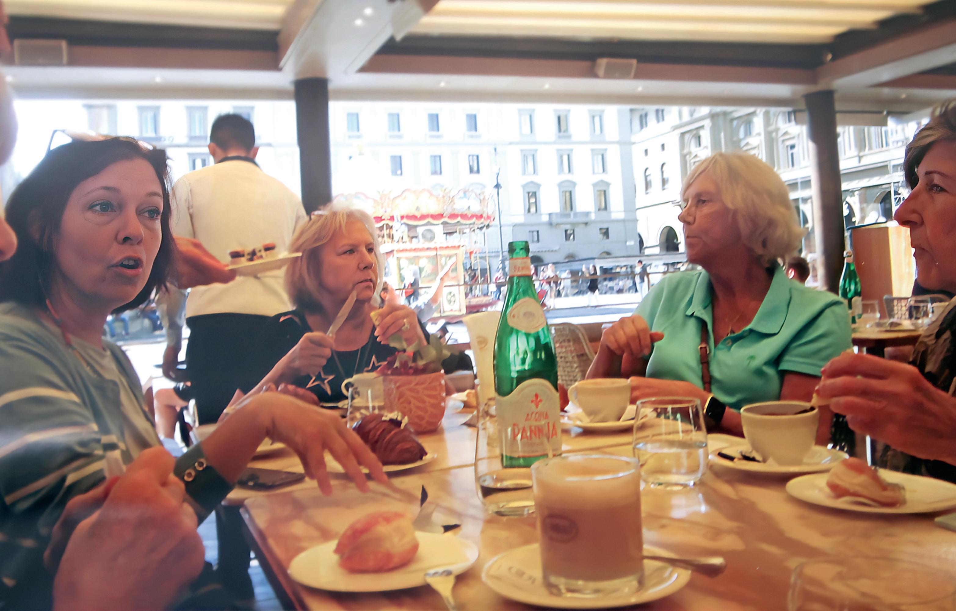 It wouldn’t be Europe without challenges to add to the drama—first, a strike by transportation workers in Florence, then, more daunting, another one shutting down the airport in Paris through which many of our return flights were channeled. But the food alone—never mind the art—made up for the stress: a pizza night arranged by Inez: “Allora! The best pizzeria in Florence!” she promised (one taste and no arguments from us); a feast of the famous Florentine beefsteak born of the region’s special cattle; gelato at Perche Non? (“Why Not?”); and pastries at Gilli, aside the buzzy Piazza Republica with its revolving carousel.