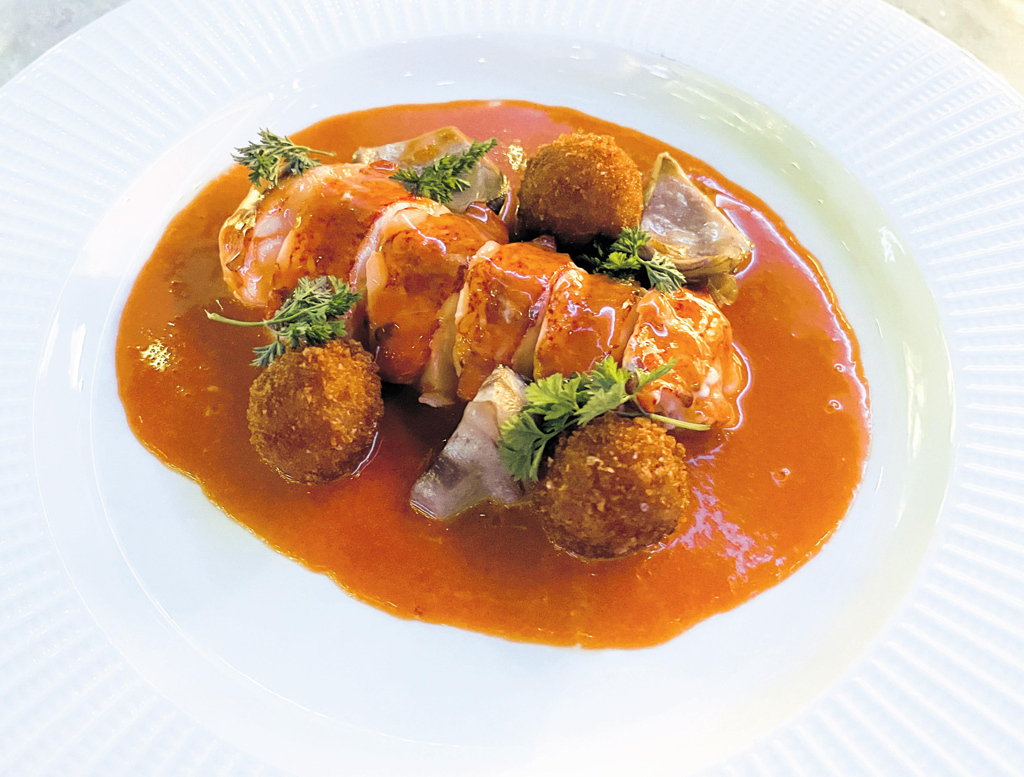 That’s three rich courses so far, so why not make it four? Especially when we spied lobster ($29) on the list. The sweet, perfectly timed tail flesh could come out on a saltine cracker and I’d be happy. But, making us happier still, it’s served bathed lightly in Sauce Americaine (onions, tomatoes, white wine, butter, fish stock and whatnot), presented with bits of artichoke and mildly simmering fresno chilies.