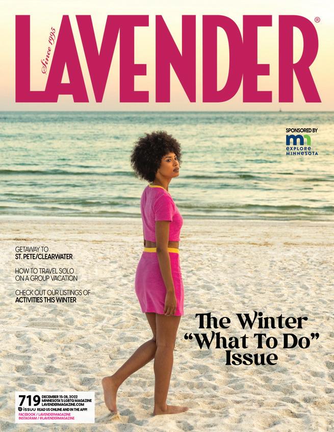 5100 Eden Ave, Suite 107, Edina, MN 55436 612-436-4660 O ce 612-436-4660 Subscriptions/Distribution 612-436-4660 Lavender Advertising Entire contents copyright 2022. All rights reserved. Publication of the name or photograph of any person, organization, or business in this magazine does not re ect upon one’s sexual orientation whatsoever. Lavender® Magazine reserves the right to refuse any advertising. This issue of Lavender Magazine is available free of charge during the time period published on the cover. Pickup at one of our distribution sites is limited to one copy per person. Letters are subject to editing for grammar, punctuation, space, and libel. They should be no more than 300 words. Letters must include name, address, and phone number. Unsigned letters will not be published. Priority will be given to letters that refer to material previously published in Lavender