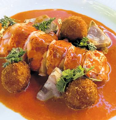 The dreamy setting, under a transparent domed ceiling, is couched in cozy shadows, backlit in soft lavender. Tables, banquettes and bar stools aside the open kitchen welcome lovers of bistro classics, which del Prado has edited for today’s palates—a list of 21 delectable edibles ranging from small-plate snacks (oysters, shrimp or tuna crudo, etc.) to mini-entrees like lobster, scallops and a full-on cote de boeuf for two, $95. (Not to worry: Many of the shareable plates ring in under $20.)