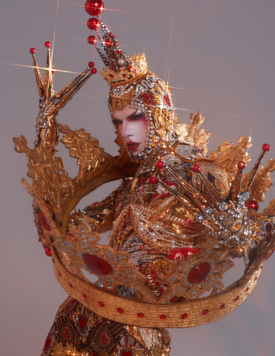 Since his departure from the reality competition, Mundt has continued to catch the eyes of fans with stunning, elevated fashions appearing on both Utica Queen herself and her sisters in the drag scene, on and off the “RPDR” stages. Mundt’s drag designs stand out with dramatic silhouettes and a refined point of view, becoming works of art of their own. Lavender Magazine even covered a costume installation featuring and curated by Mundt at the Rochester Art Center in 2021.