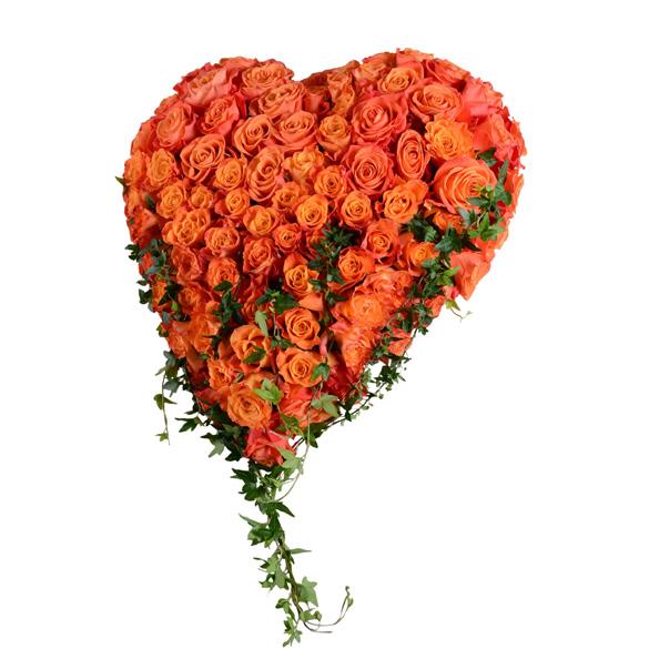 Kärleksfullt hjärta till urna av röda rosor, liljor, riddarsporre och grönt, Hjärtat är ca 32-36 cm, beroende på urnans storlek. Kombinera gärna med band.