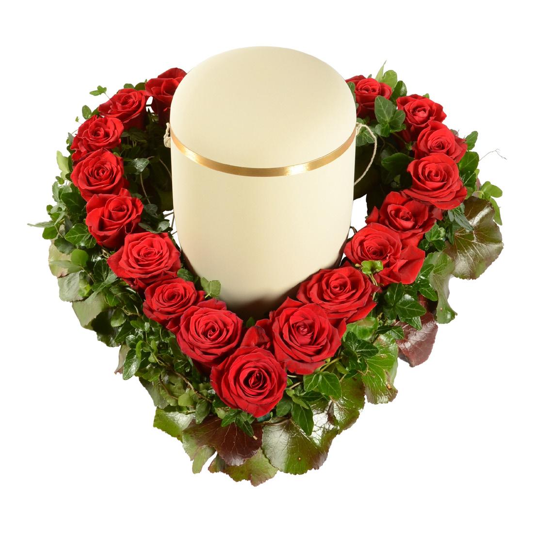 Vackert hjärta som omfamnar urnan. Vita rosor, liljor, brudslöja och vackert grönt. Hjärtats storlek är ca 32-36 cm beroende på urnans storlek.