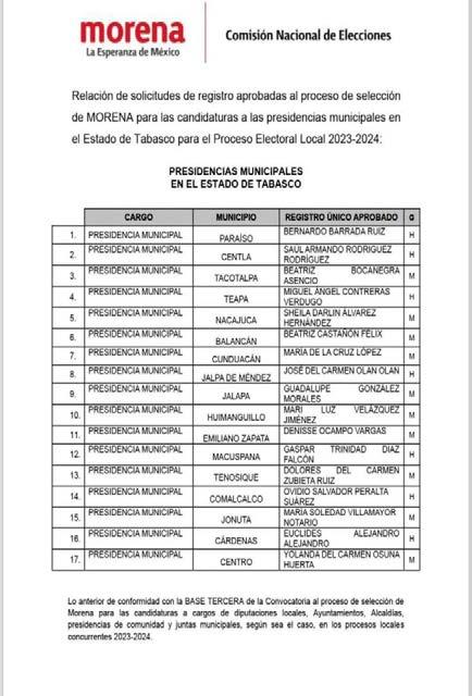 La lista de Morena para las presidencias municipales de Tabasco quedó integrada de la siguiente manera: